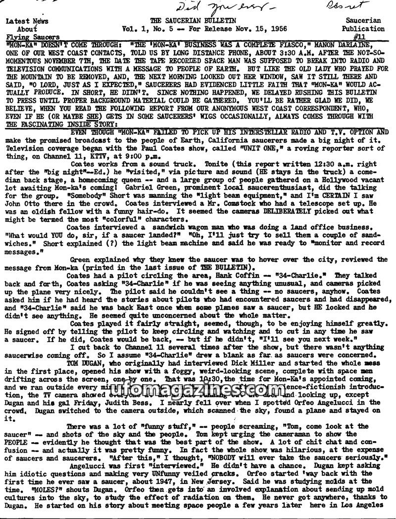 This issue of The Saucerian Bulletin details the widely anticipated but ultimately failed 'Mon-ka' broadcast, which was intended to deliver a message to Earth. The publication cove