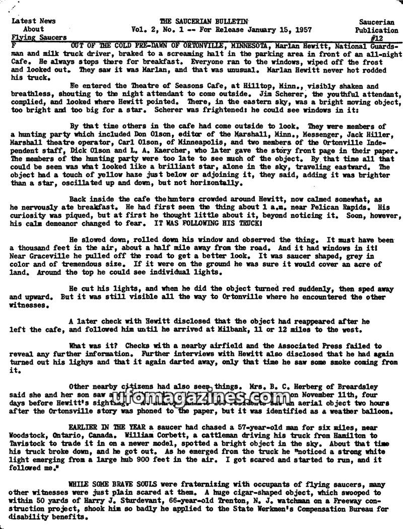 This issue of The Saucerian Bulletin, dated January 15, 1957, reports on a significant UFO sighting by Marlan Hewitt in Ortonville, Minnesota, who described a saucer-shaped object