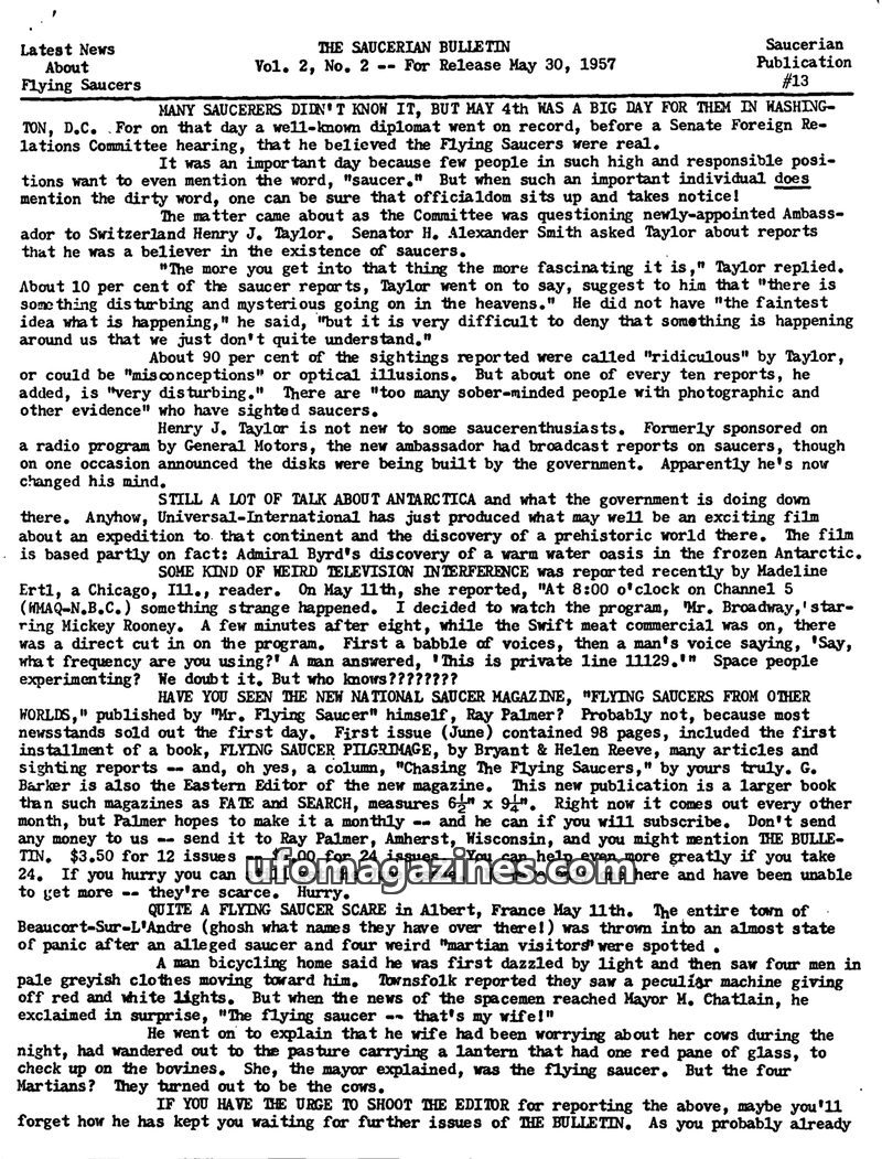 This issue of The Saucerian Bulletin reports on Ambassador Henry J. Taylor's public acknowledgment of the reality of flying saucers. It also delves into the controversial activitie