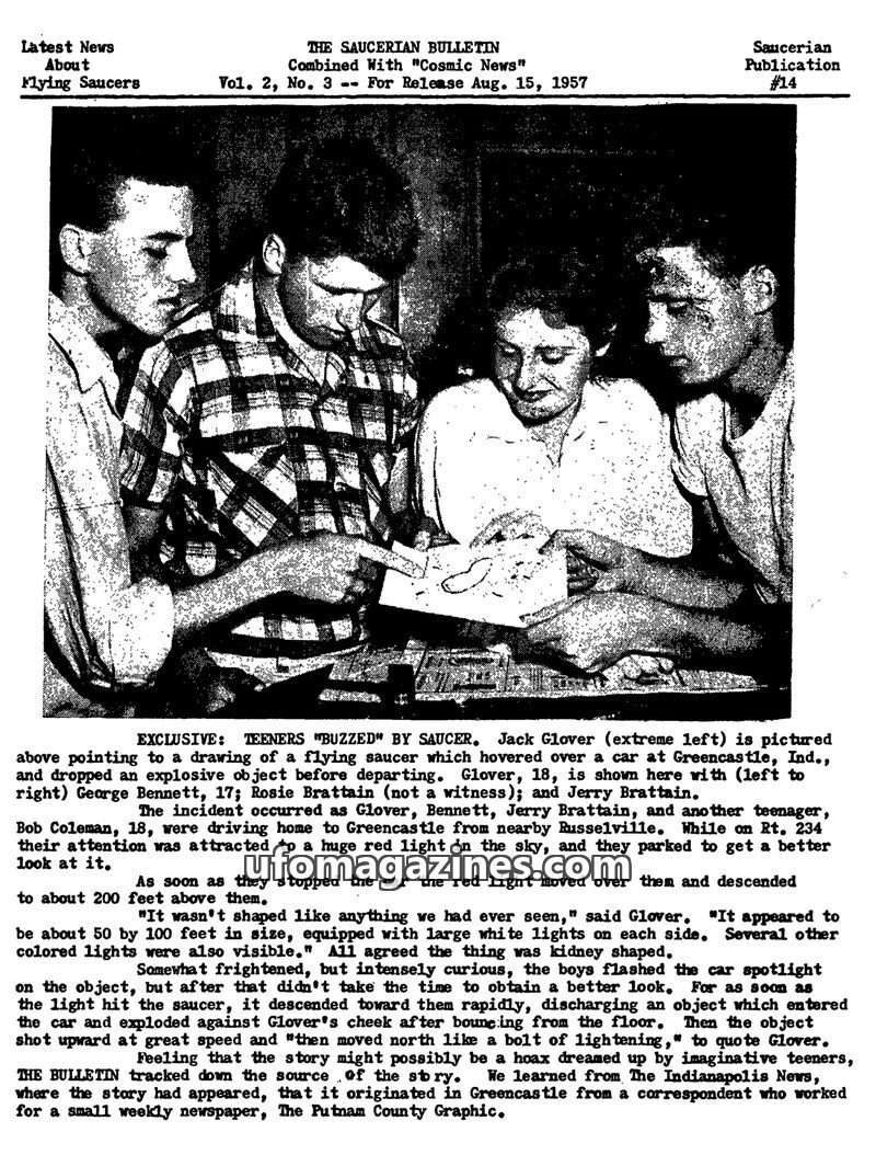 This issue of The Saucerian Bulletin reports on a UFO sighting by teenagers in Greencastle, Indiana, where they described a kidney-shaped object that discharged an explosive object