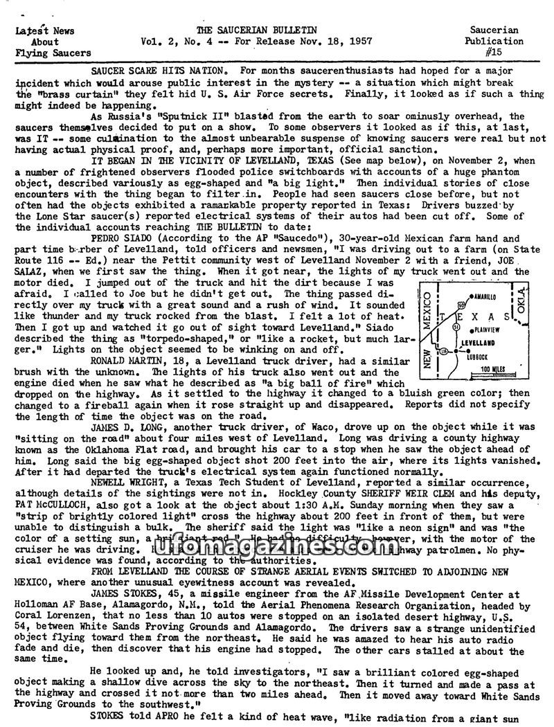 This issue of The Saucerian Bulletin reports on a widespread "saucer scare" in November 1957, coinciding with the Sputnik II launch. Numerous sightings occurred across the US, nota