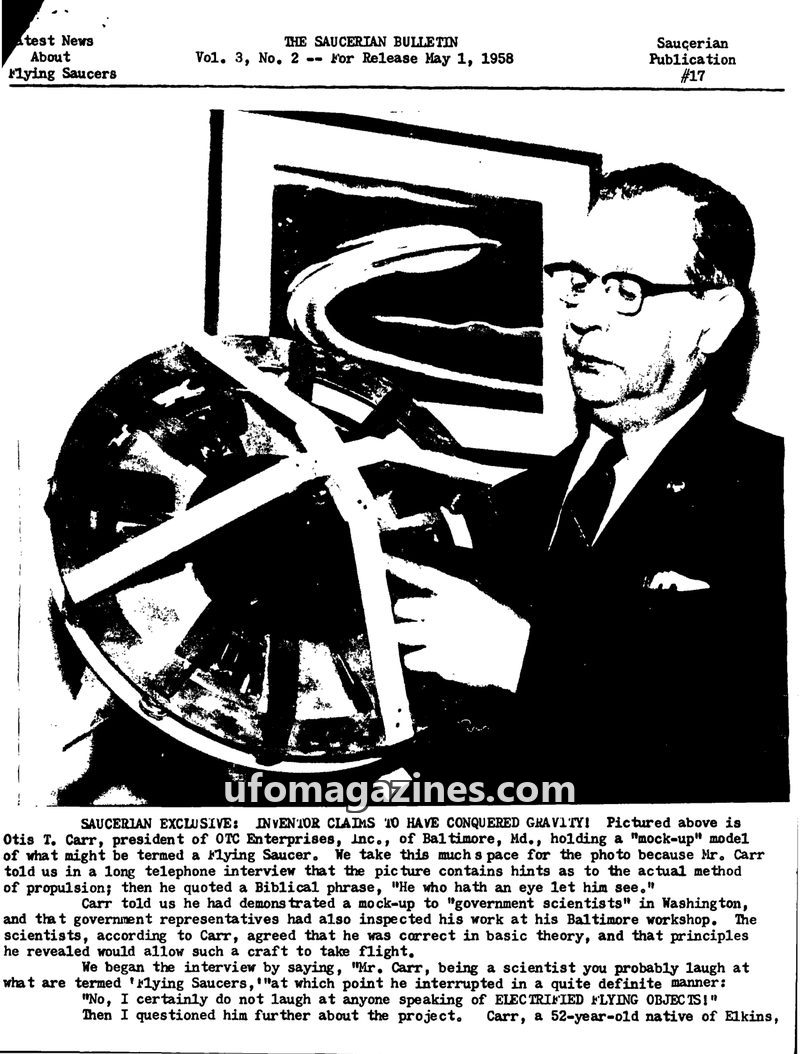 This issue of The Saucerian Bulletin highlights Otis T. Carr's claim of conquering gravity with his 'Flying Saucer' invention, which he demonstrated to government scientists. The m