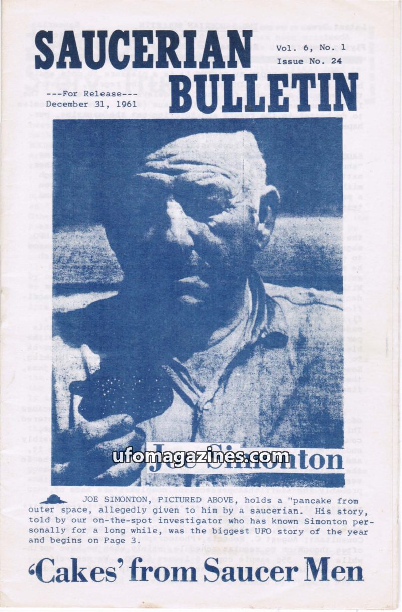 This issue of Saucerian Bulletin details the alleged encounter of Joe Simonton with extraterrestrials who gave him a food item resembling a pancake. County Judge Franklin Carter in