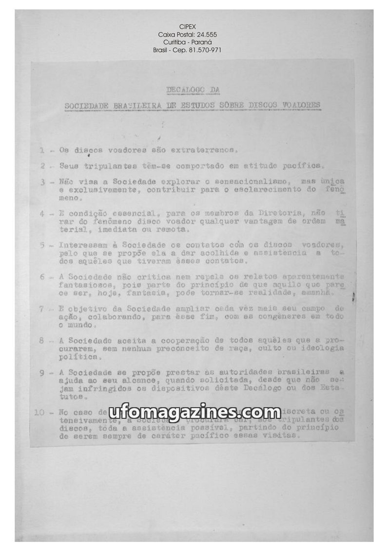 This bulletin from the Brazilian Society for the Study of Flying Saucers (SBEEV), issued in December 1957, outlines its ten-point decalogue, emphasizing a scientific and non-sensat