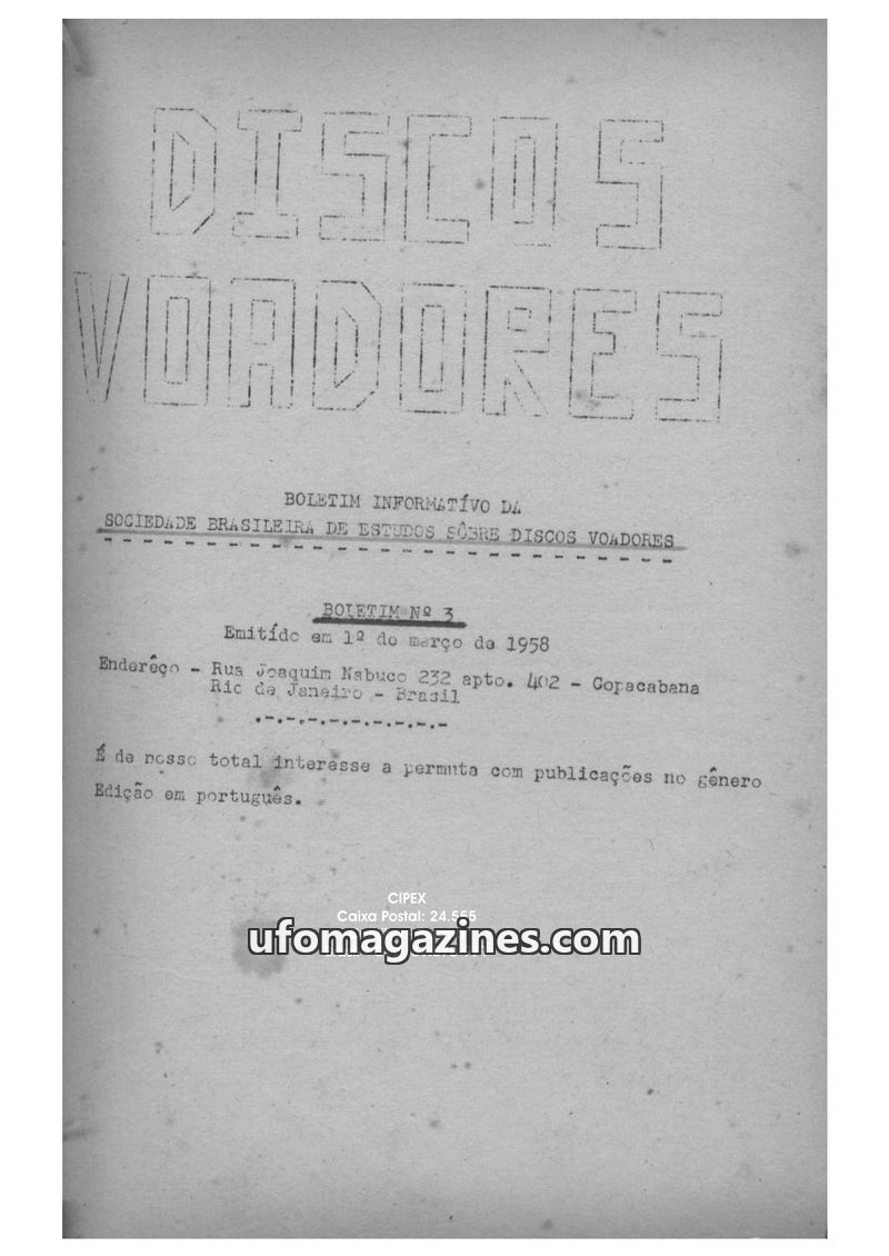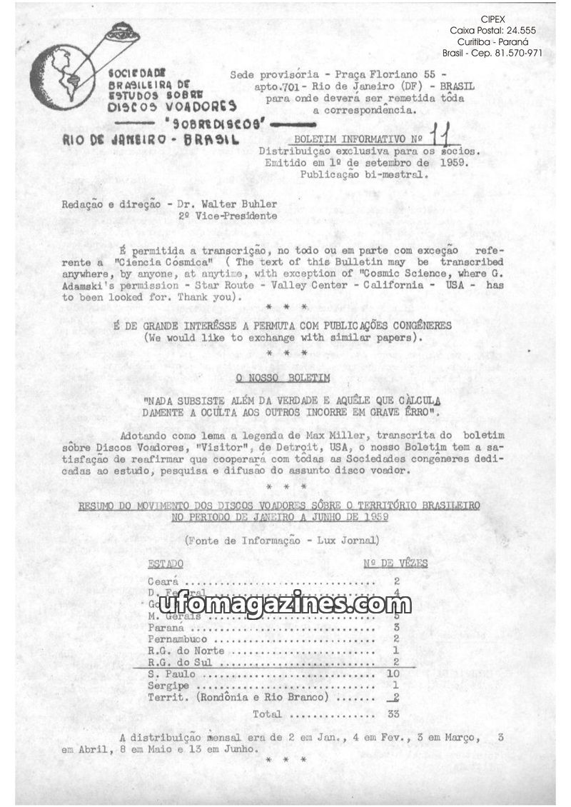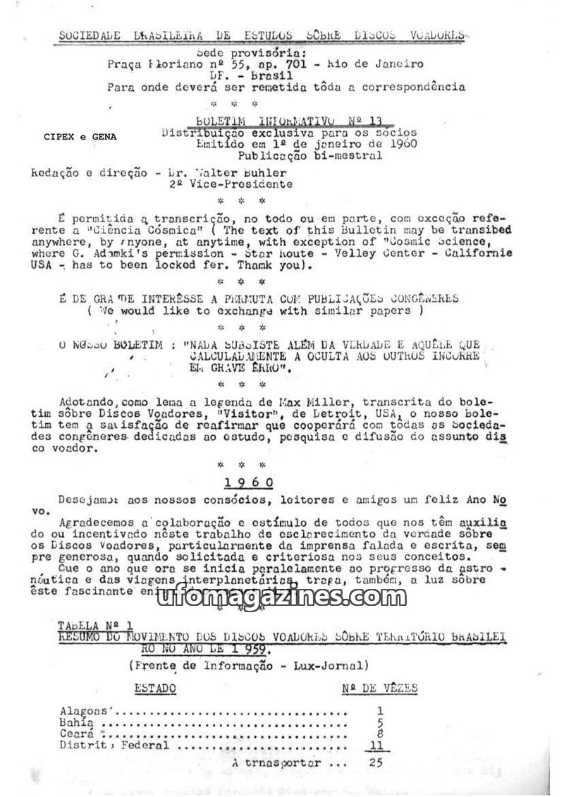 This issue of the Brazilian Society for the Study of Flying Saucers' bulletin provides a statistical analysis of UFO sightings in Brazil between November 1957 and December 1958, de