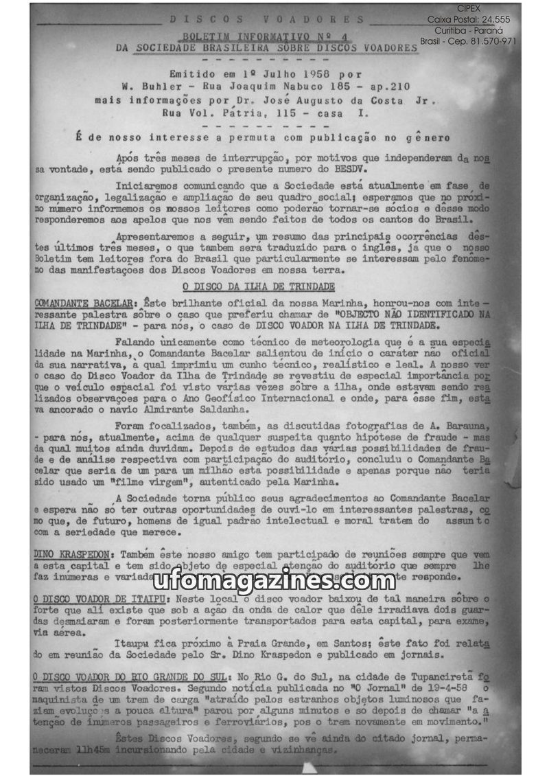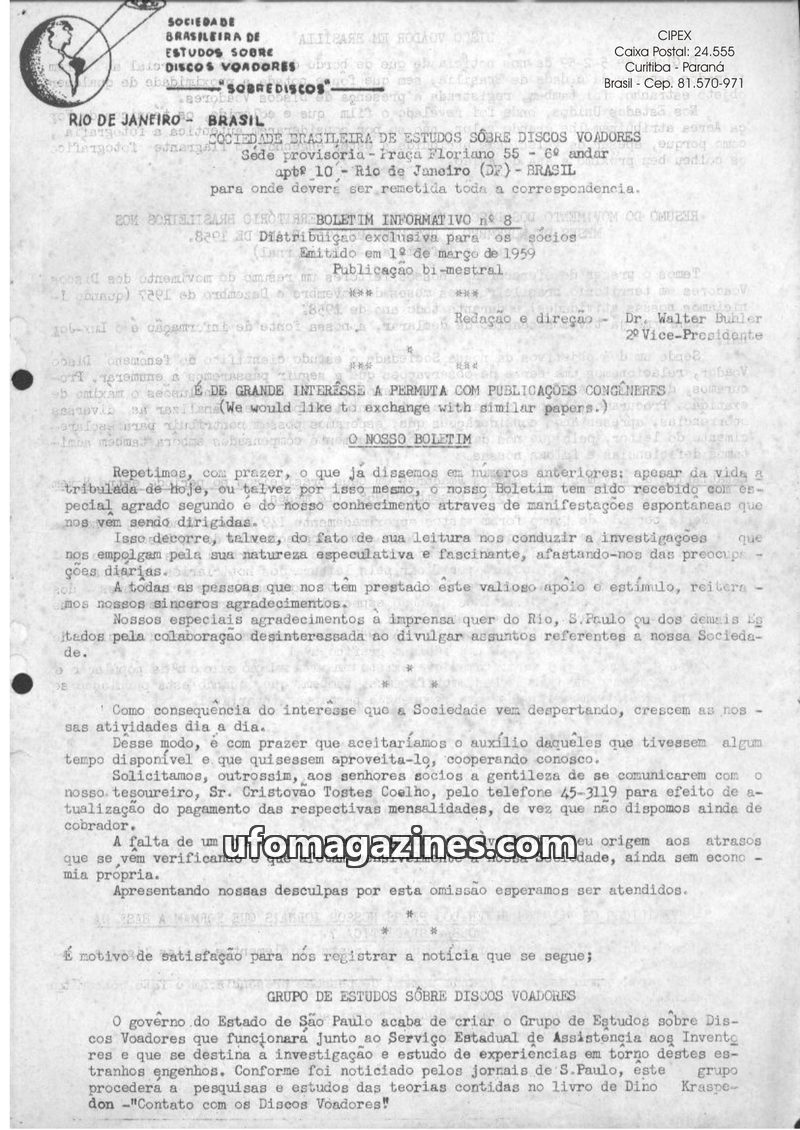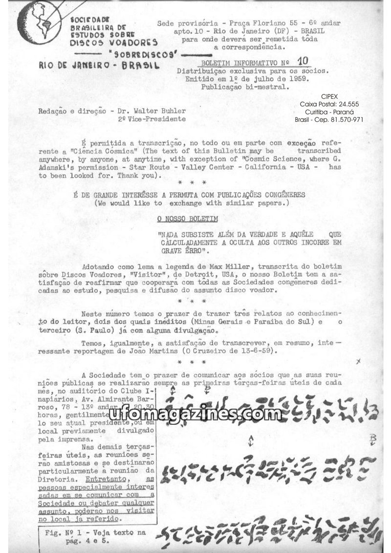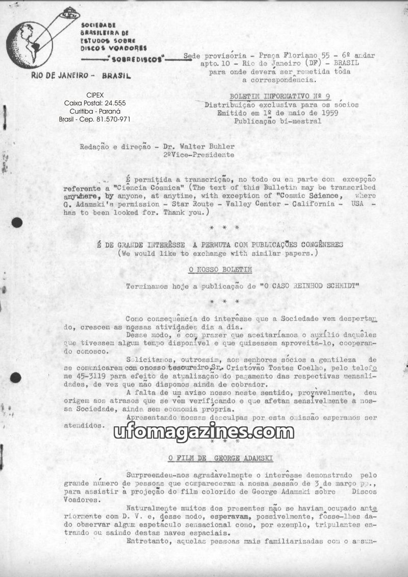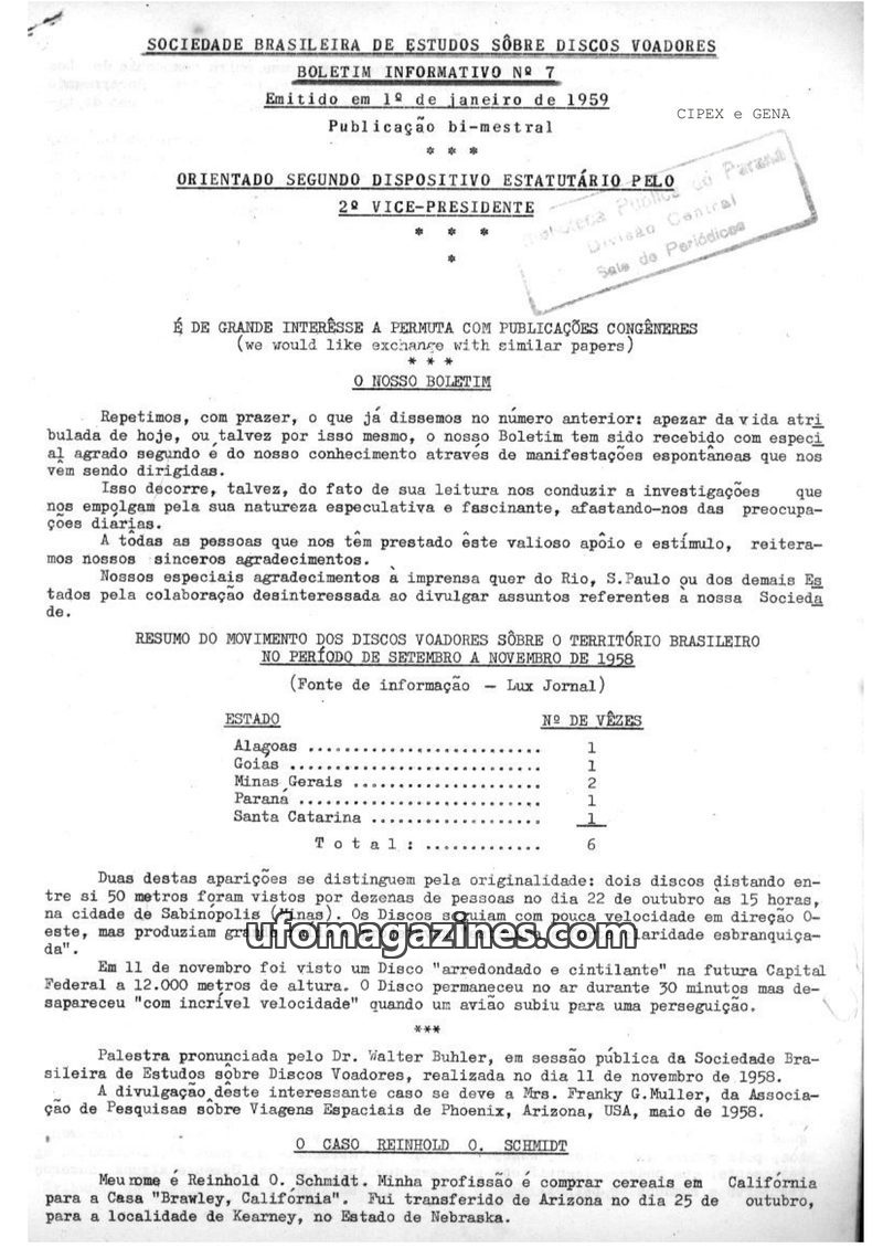 This issue of the Brazilian UFO Bulletin from January 1959 details UFO sightings in Brazil during late 1958 and features a lengthy first-hand account by Reinhold O. Schmidt of an e