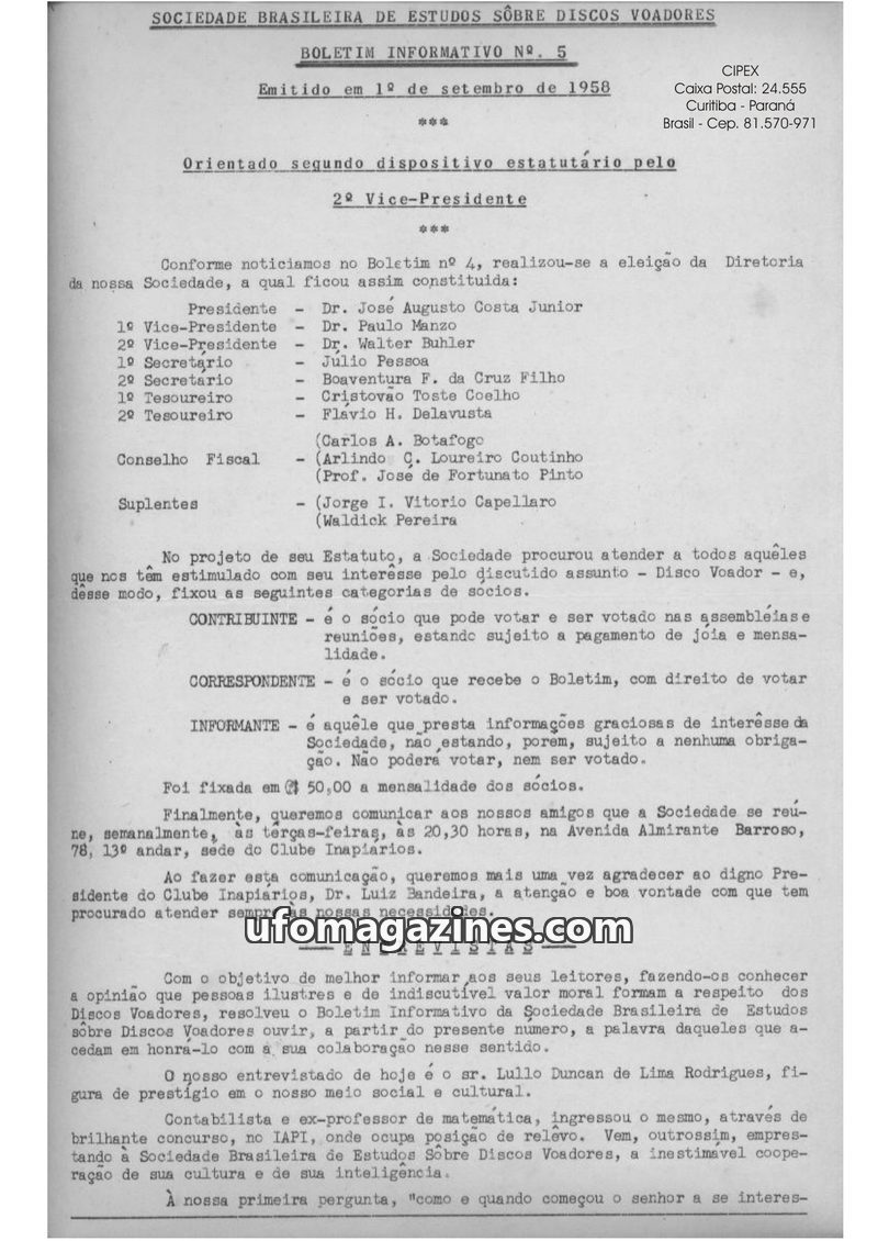 This issue of the Boletim Informativo details the election of the new board for the Brazilian Society for the Study of Flying Saucers and outlines its membership categories and mee