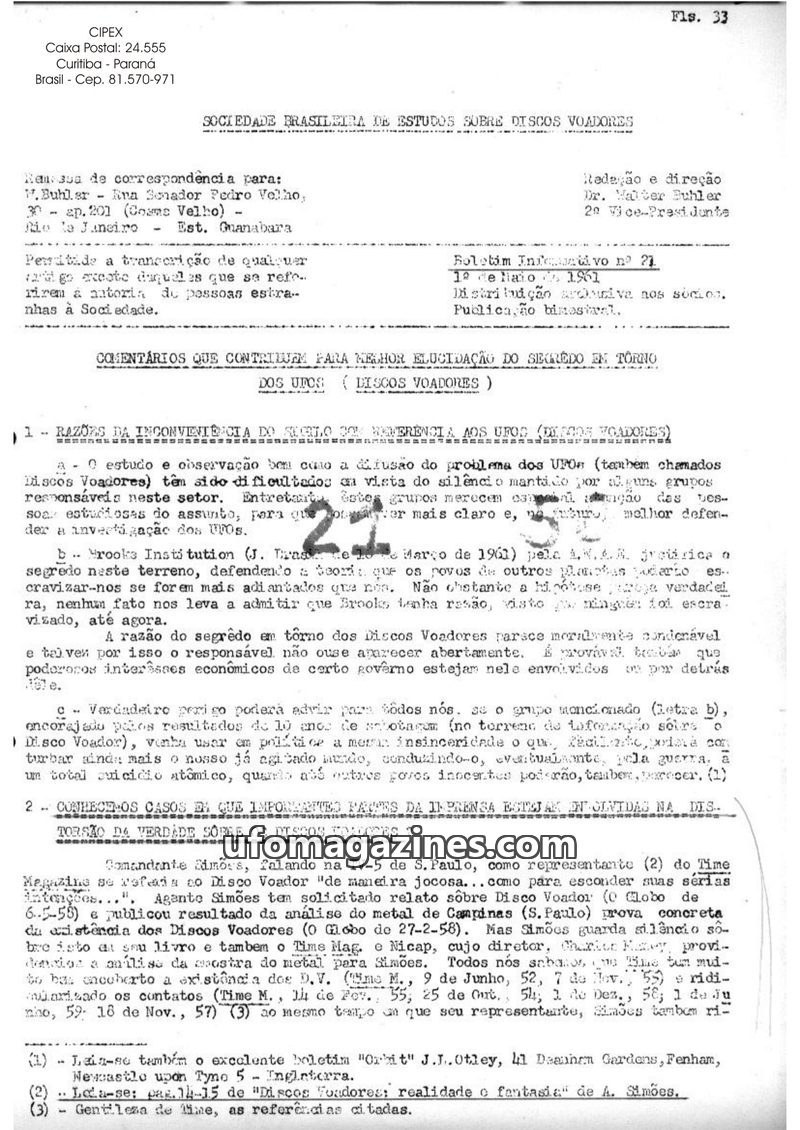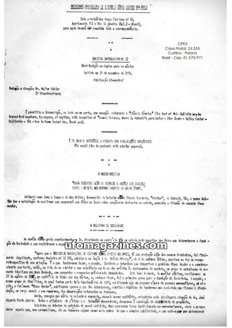 This bulletin from the Brazilian Society for the Study of Flying Saucers (SBEDV) outlines the organization's structure and goals, emphasizing its ongoing development and lack of a