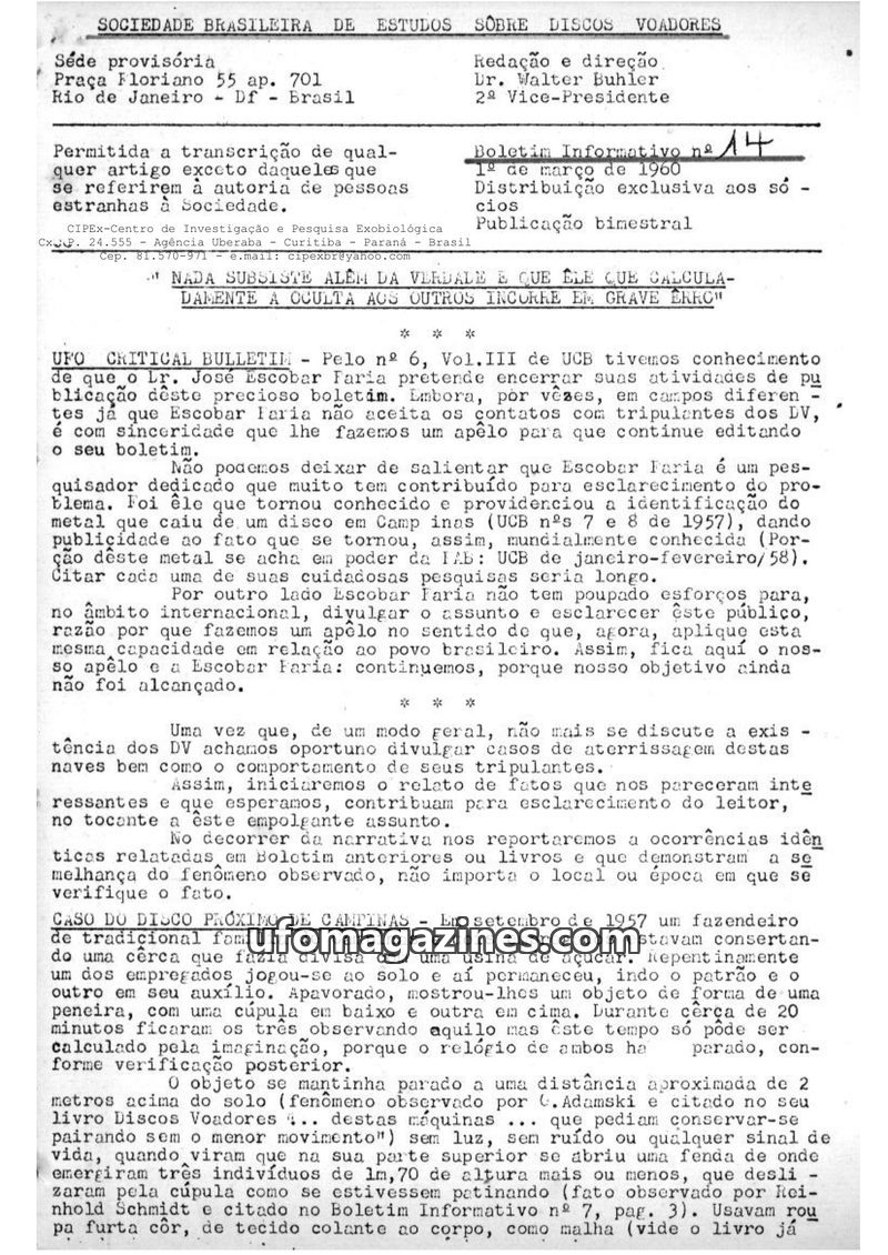 This issue of the Boletim Informativo from the Brazilian Society for UFO Studies (Estudisco) details recent UFO sightings in Brazil between December 1957 and January 1958, includin