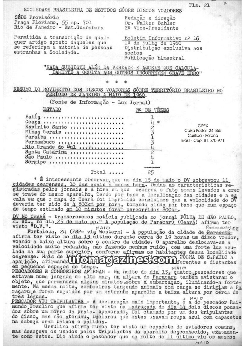 This issue of the Boletim Informativo details UFO sightings across Brazil between January and May 1960. A significant report from Ceara describes a UFO flying over multiple cities