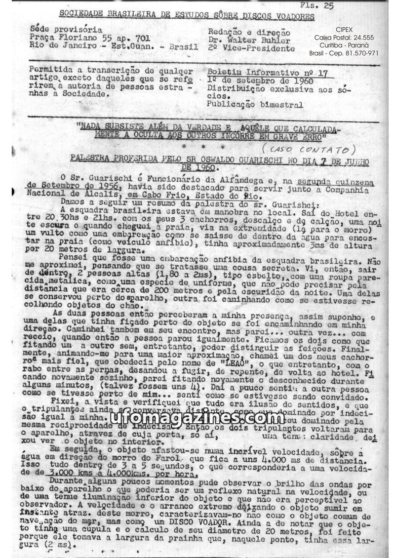This issue of the Brazilian Society for the Study of Flying Saucers' bulletin features a detailed account of a UFO sighting by Oswaldo Guarischi in Cabo Frio in September 1956. Gua