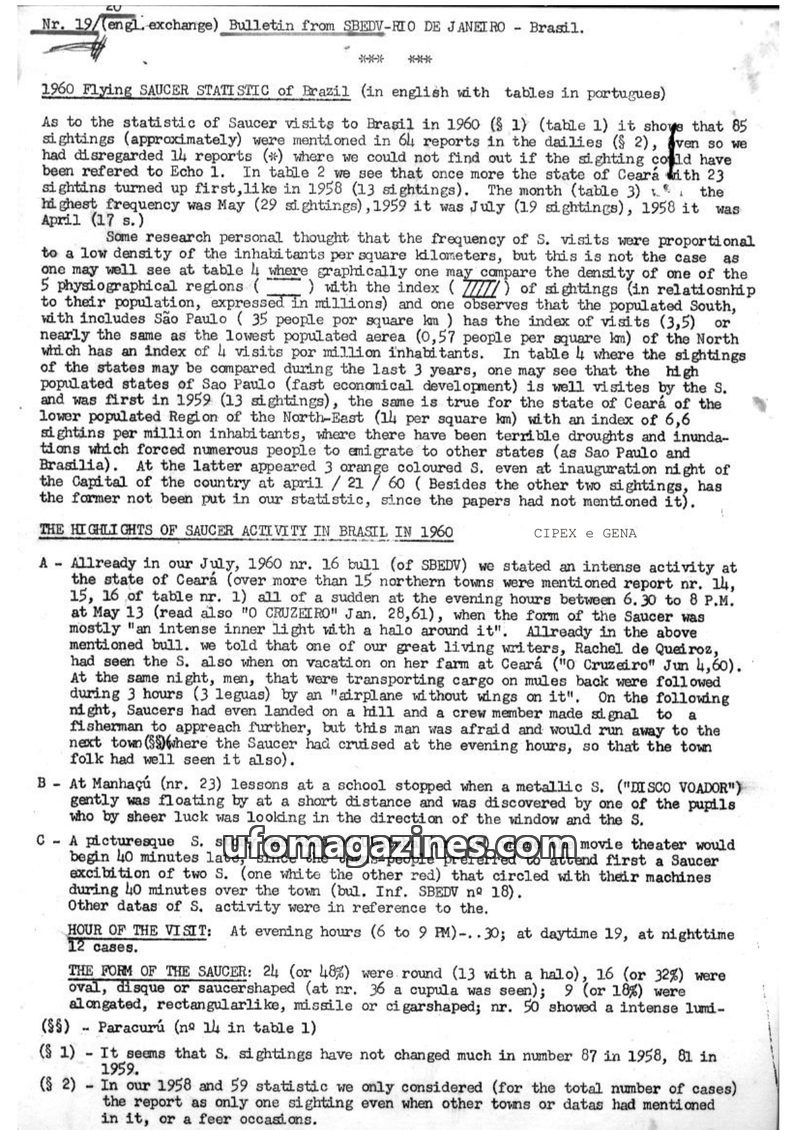 This issue provides a statistical breakdown of 85 flying saucer sightings reported in Brazil during 1960, with Ceará state having the highest frequency. The data analyzes sighting