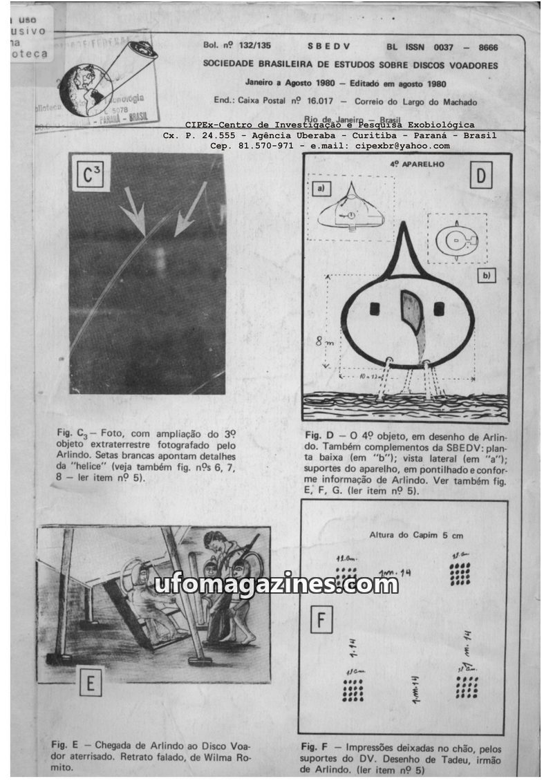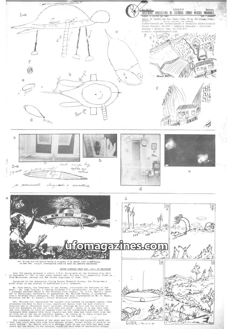 This issue of SBEDV details multiple UFO sightings and encounters, primarily focusing on the experiences of a witness named Arlindo. It includes photographic evidence, detailed dra