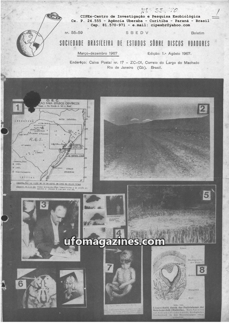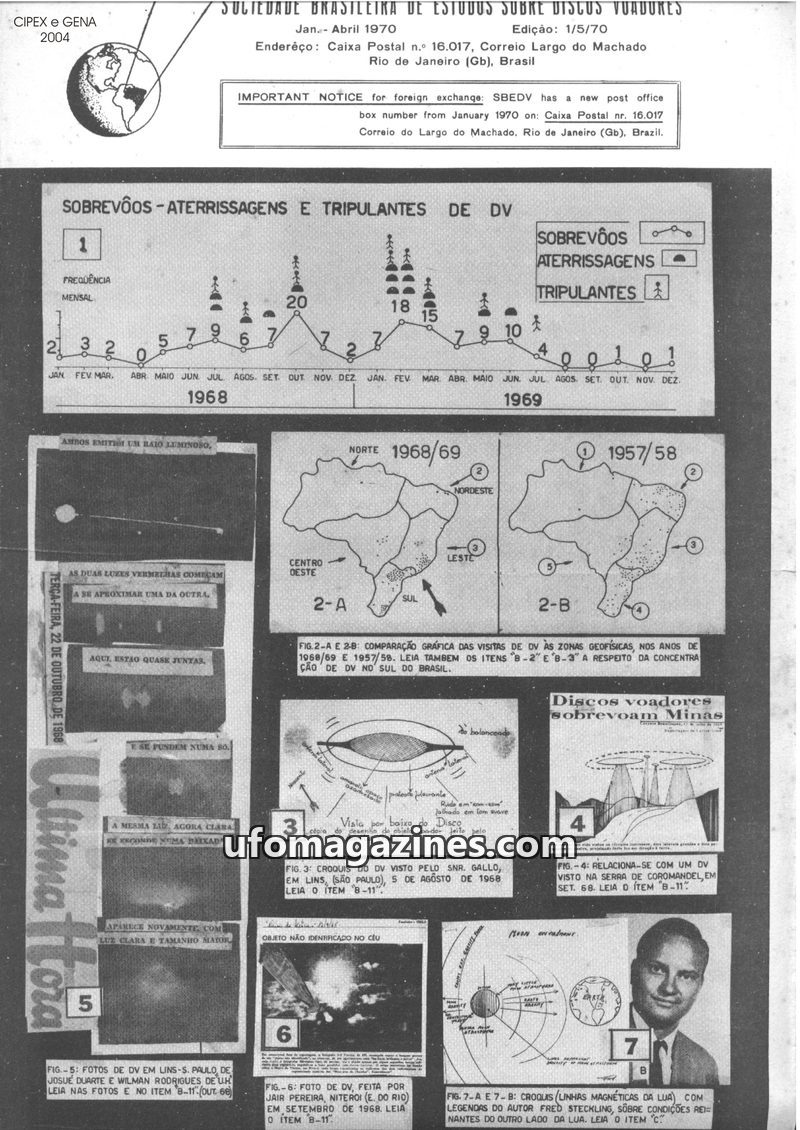 This issue of SBEDV focuses on UFO research in Brazil, presenting data on sightings, landings, and occupants between 1958 and 1970. It includes obituaries for key figures like Lou