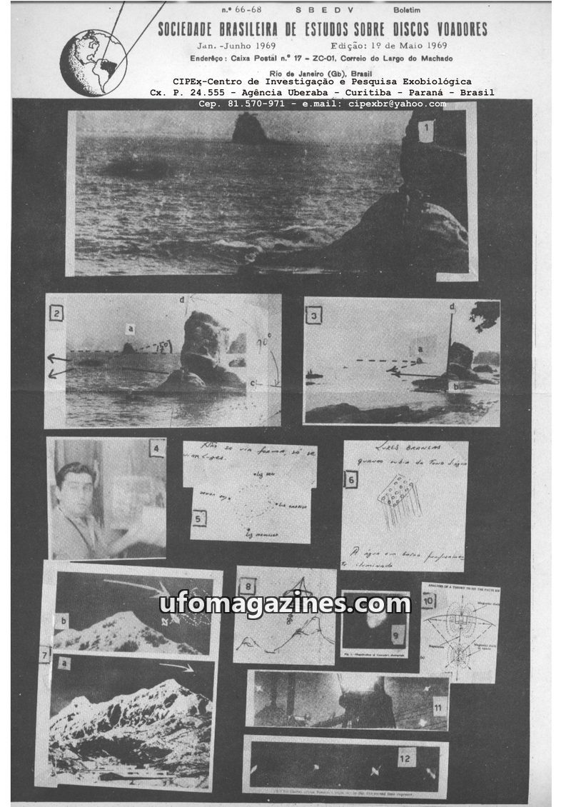 This issue of the SBEDV bulletin from May 1969 details numerous UFO sightings and alleged extraterrestrial encounters across Brazil. It includes photographic evidence, witness test