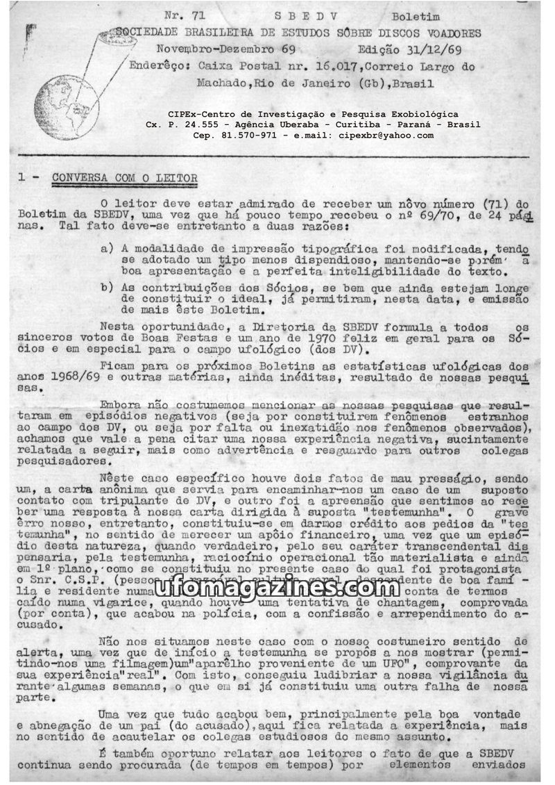 This issue of the SBEDV bulletin from July 1971 to February 1972 covers recent UFO sightings in Rio de Janeiro and Itaperuna, Brazil, and highlights research from Brazilian UFO gro