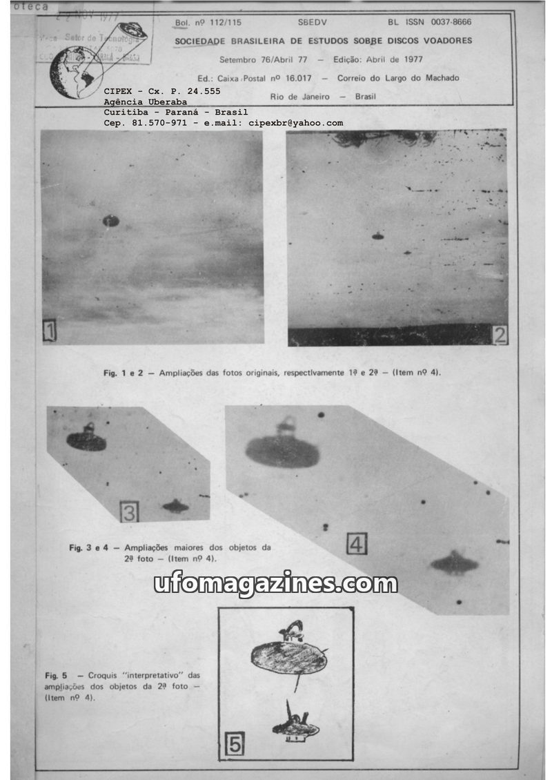 This issue of the SBEDV Boletim (No. 112/115) from April 1977 details various UFO-related events in Brazil. It includes photographic evidence, witness testimonies, and ufologist an