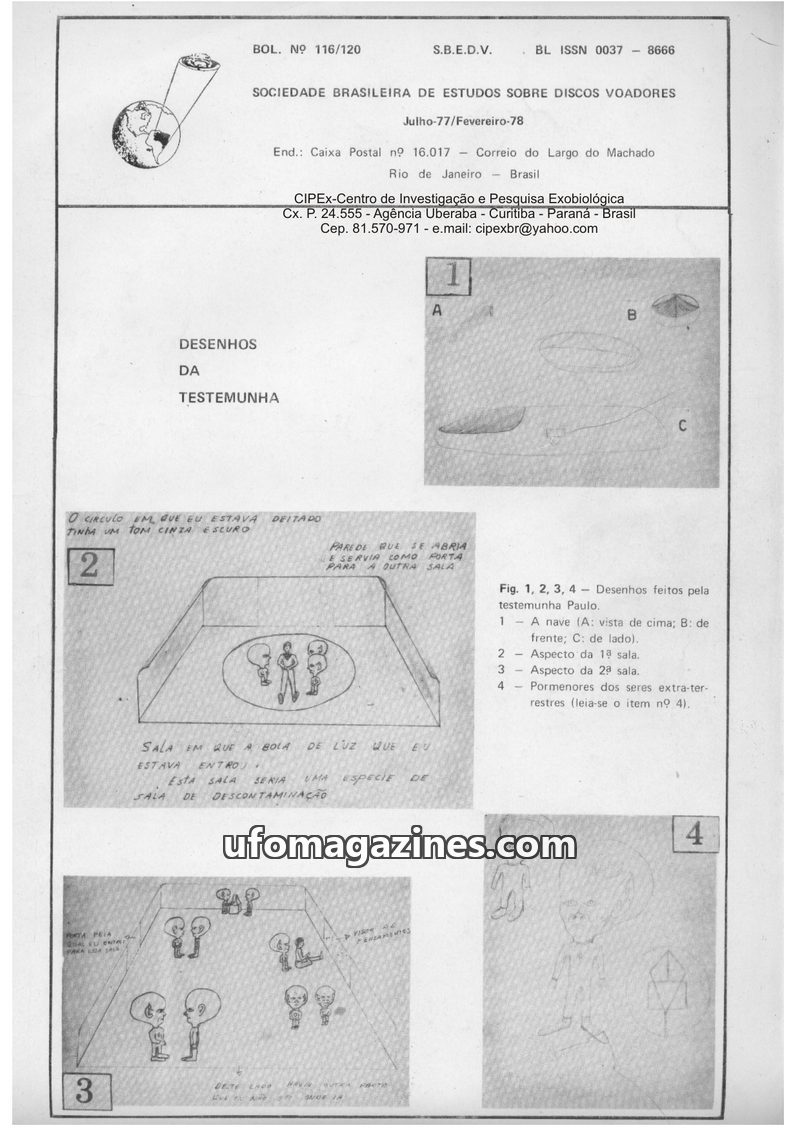 This issue of SBEDV Bulletin (Jul-Feb 1977/78) focuses on a detailed account of an extraterrestrial encounter by Paulo Coutinho in Vila Aricanduva, São Paulo, including his drawing