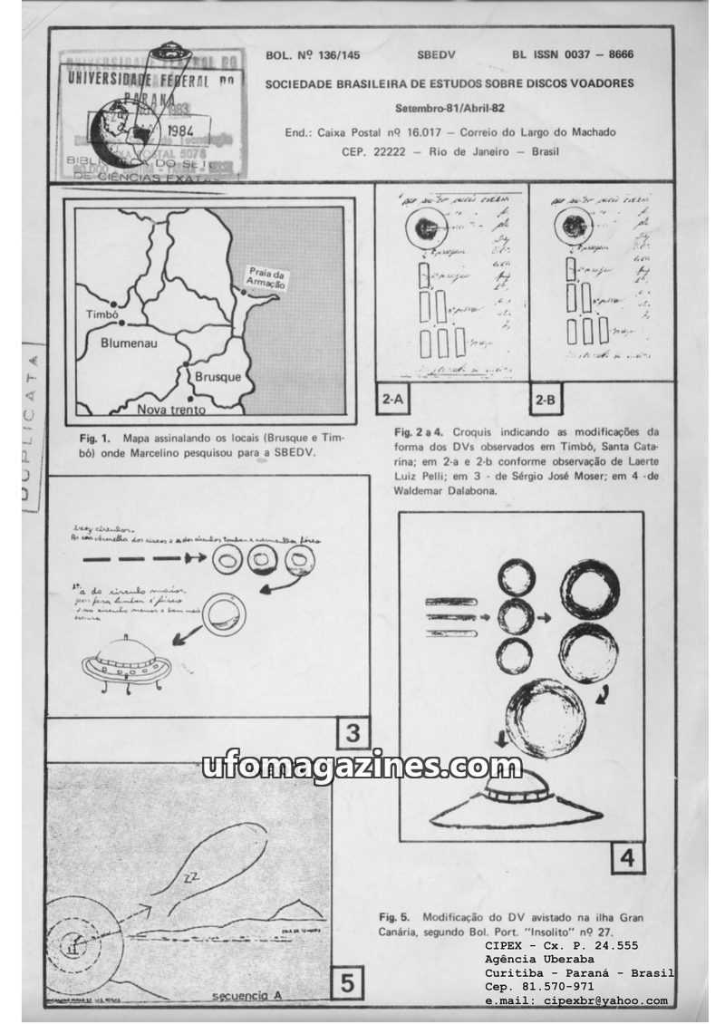 This issue of SBEDV details several UFO incidents in Brazil, primarily from the late 1970s and early 1980s. It includes witness accounts of shape-shifting UFOs in Timbó, Santa Cata