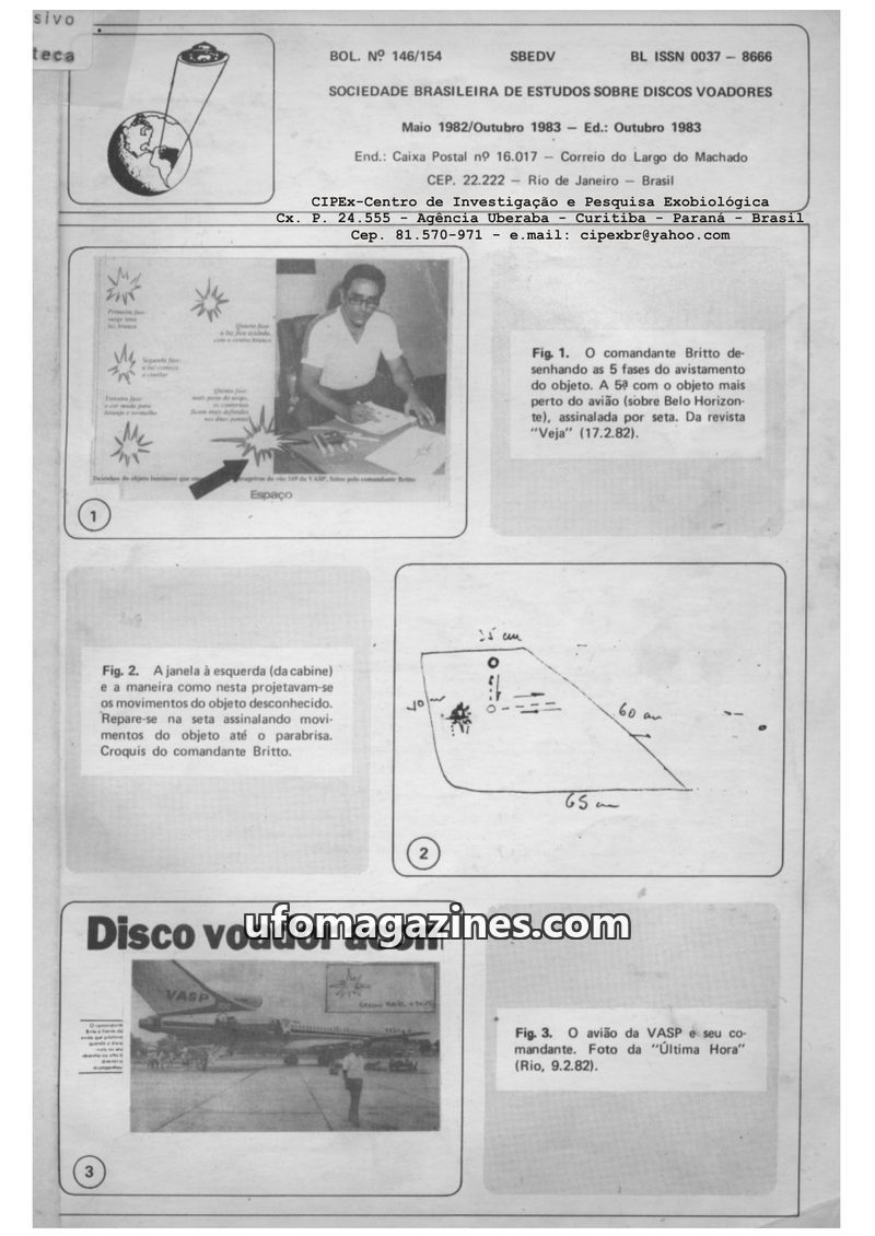 This issue of SBEDV details a significant UFO encounter involving a VASP passenger flight in early 1982. Commander Gerson M. de Britto and his crew observed a luminous object exhib