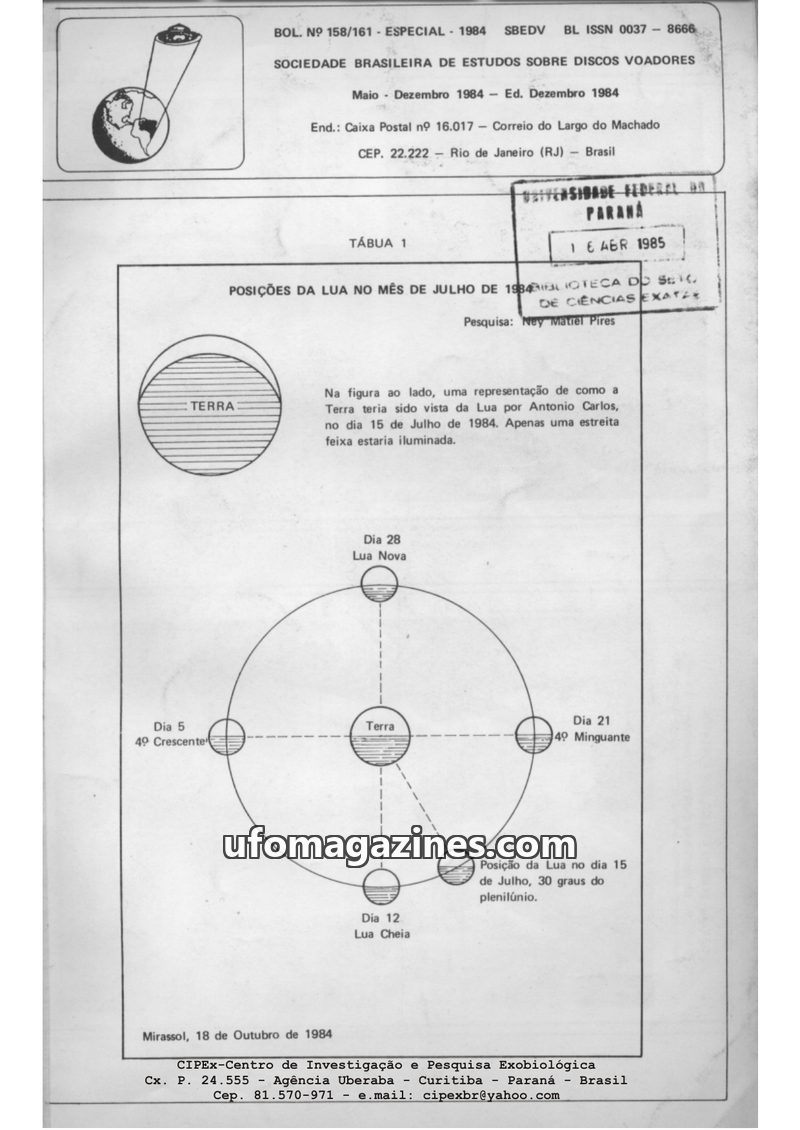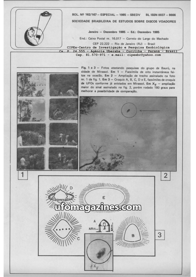 This issue of SBEDV from 1985 delves into various UFO-related topics, including detailed accounts of sightings in Mirassol and Barra da Tijuca, Brazil. It explores the connection b