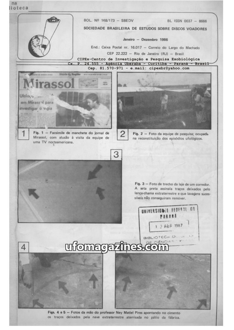This issue of SBEDV focuses on the Mirassol UFO case, detailing witness testimonies, photographic evidence, and the investigation by a North American TV team. It also touches upon
