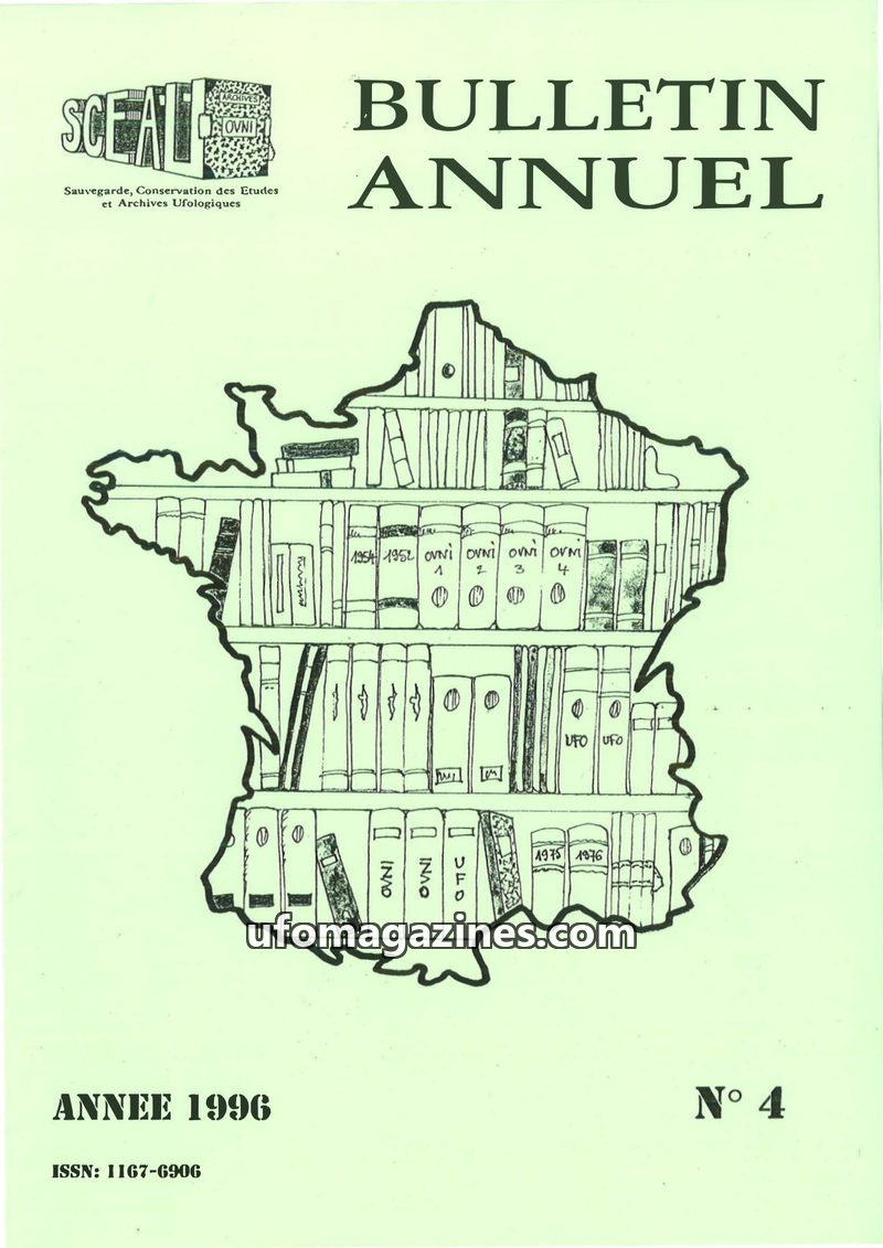 This 1996 annual bulletin from SCEAU/Archives OVNI documents the organization's extensive activities in preserving ufological archives and promoting research. Key efforts include c