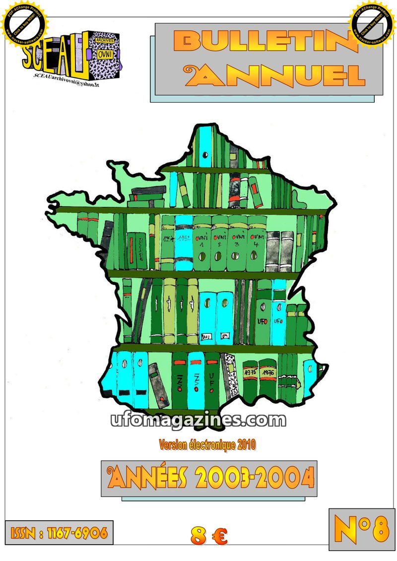 This issue of the SCEAU Archives OVNI Bulletin Annuel (N°8) covers the years 2003-2004. It details the organization's activities, including archival missions, contract signings for