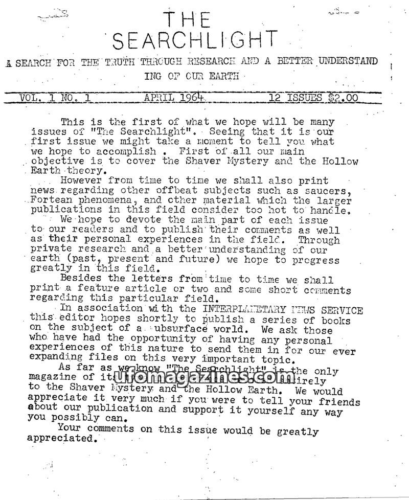 The inaugural issue of 'The Searchlight' magazine, published in April 1964, aims to explore the Shaver Mystery and Hollow Earth theory, alongside other unconventional topics. It em