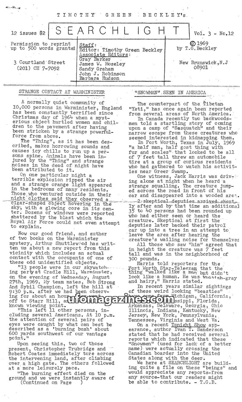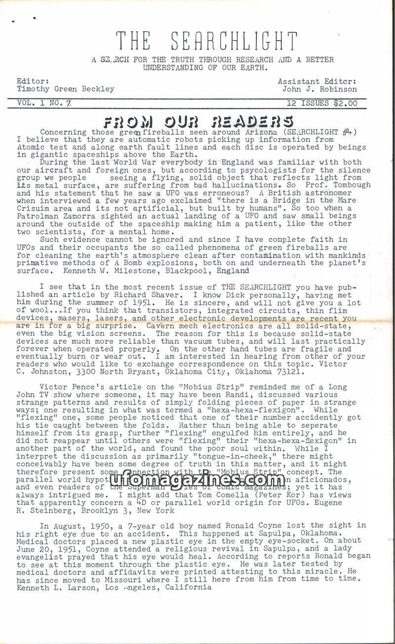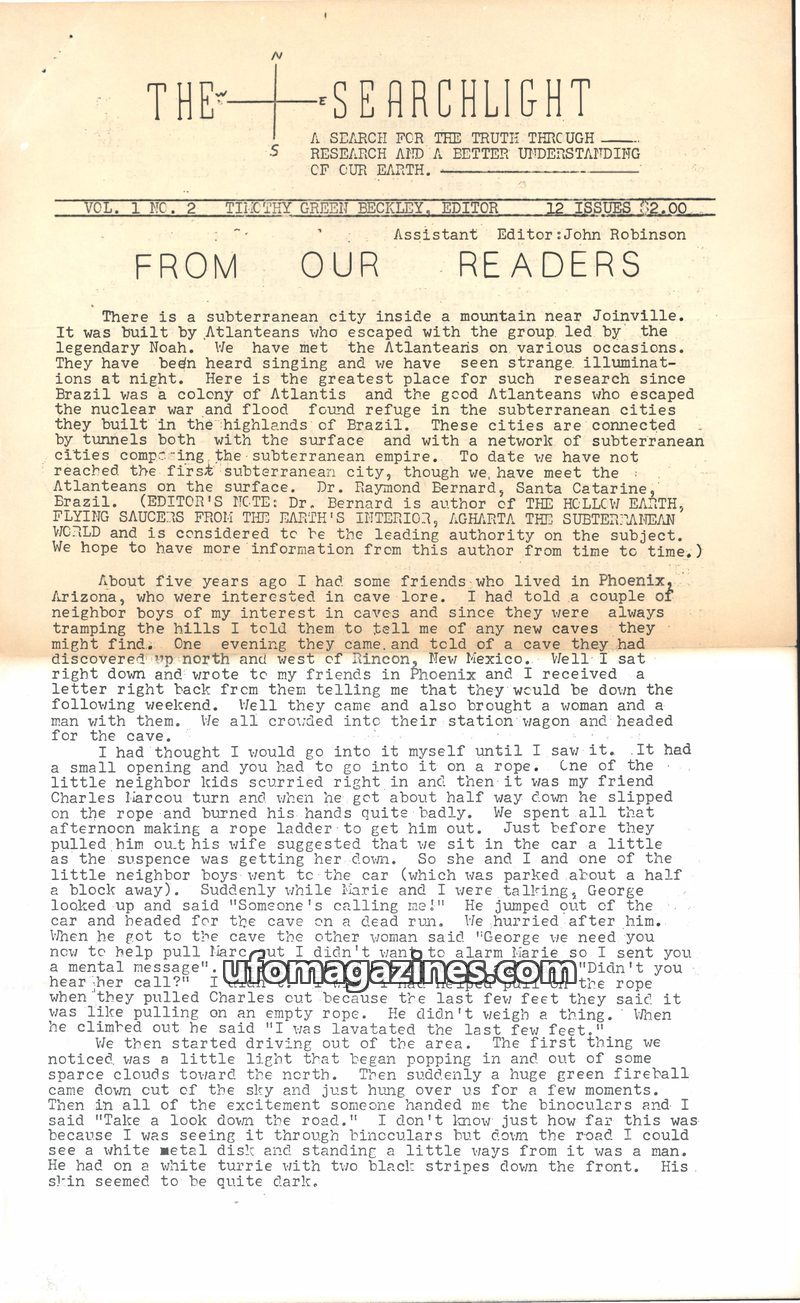 This issue of The Searchlight features reader-submitted accounts of extraordinary phenomena. It includes reports of subterranean cities in Brazil, UFO sightings and strange encount