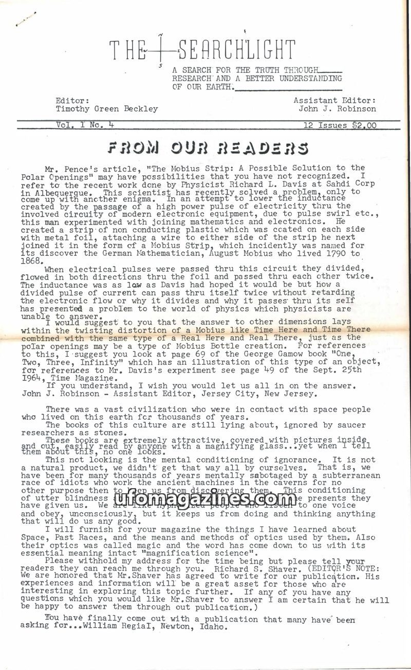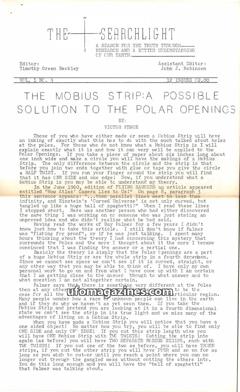 This issue of The Searchlight explores the concept of the Mobius Strip as a potential explanation for 'Polar Openings,' suggesting space itself might be a Mobius Strip. It also del