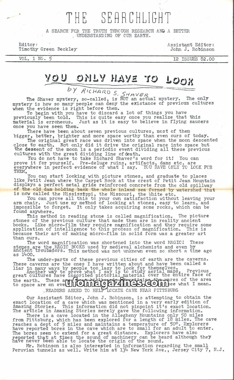 This issue of The Searchlight magazine delves into the 'Shaver mystery,' arguing that evidence of previous advanced cultures is abundant and observable. It details a personal accou