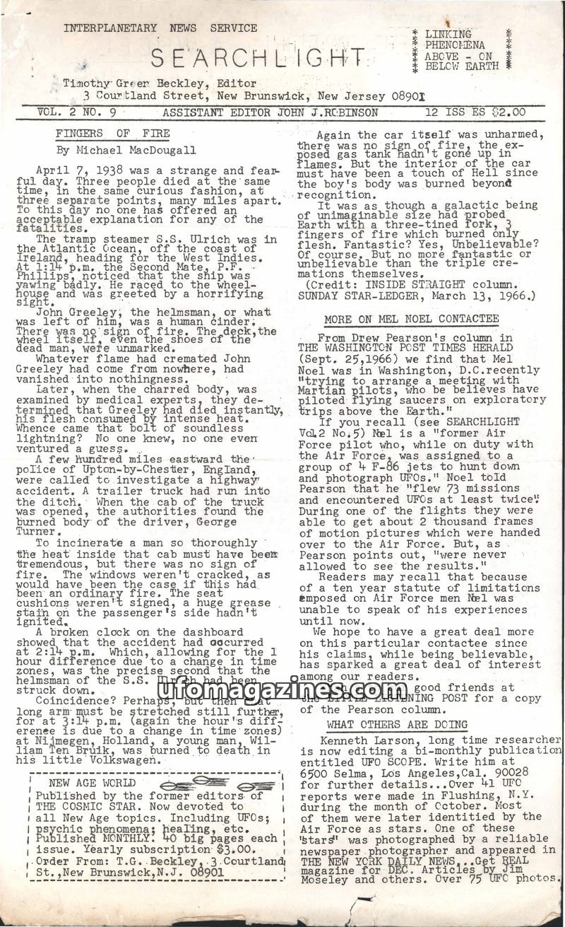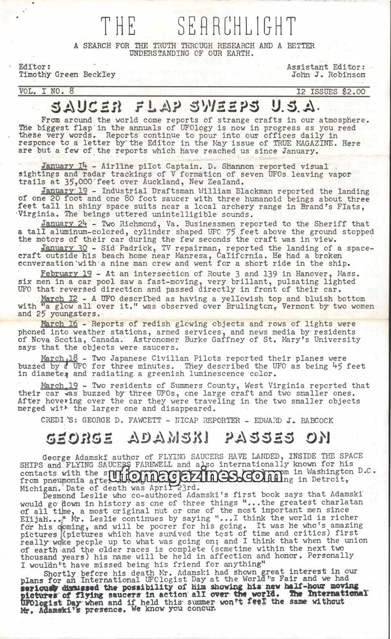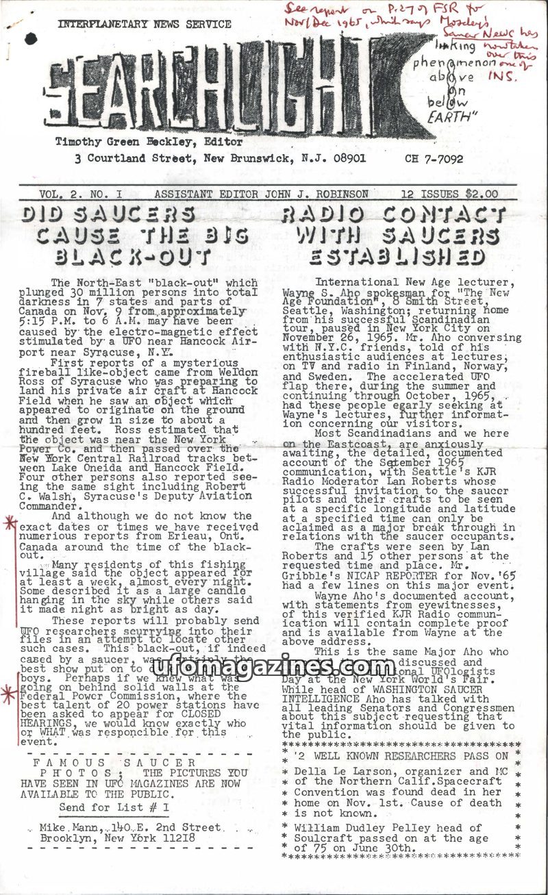 This issue of The Searchlight explores the possibility that UFOs caused the 1965 Northeast blackout, with witness accounts from Syracuse, NY, and Erieau, Ontario. It also details a