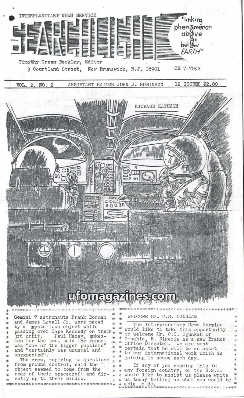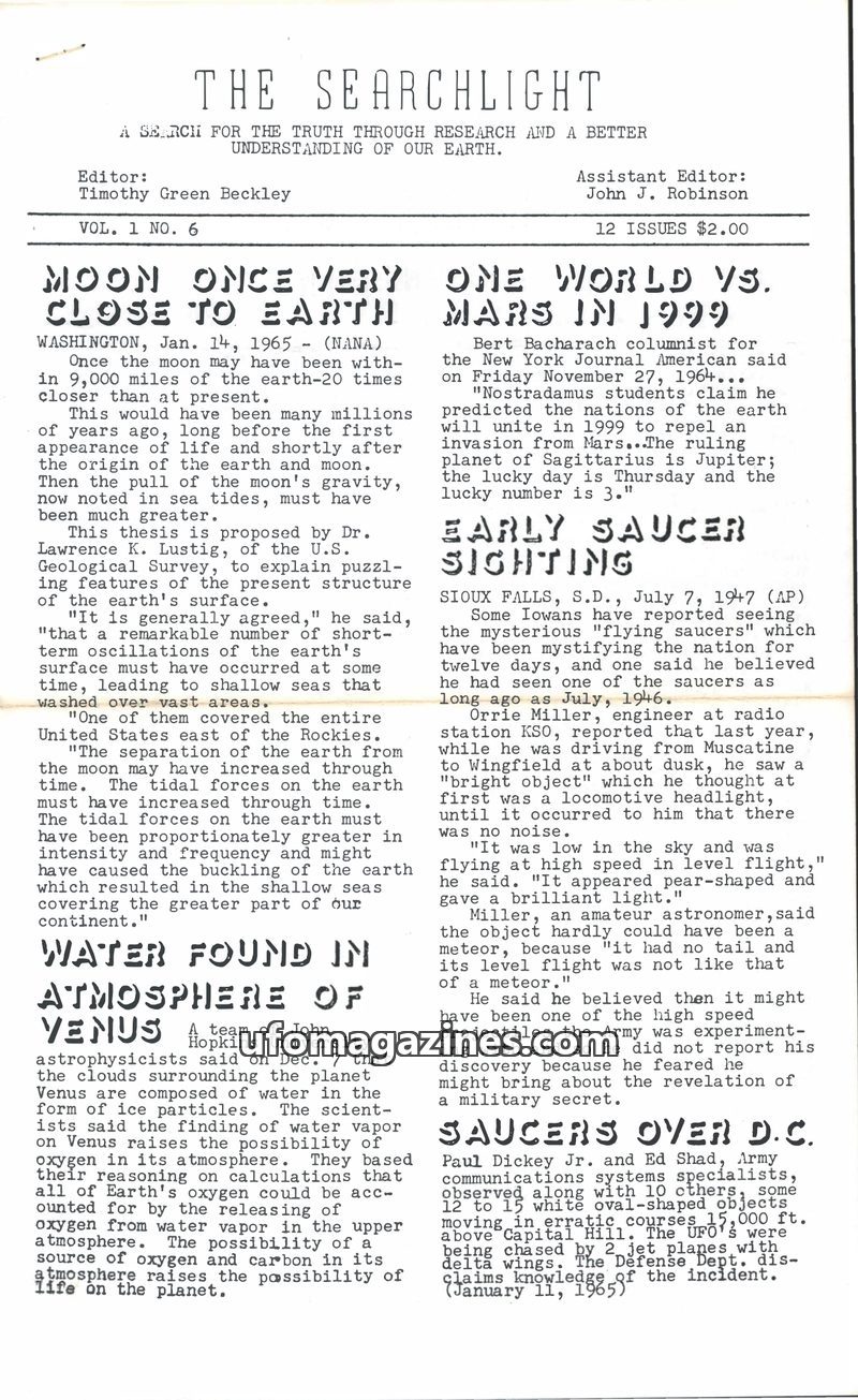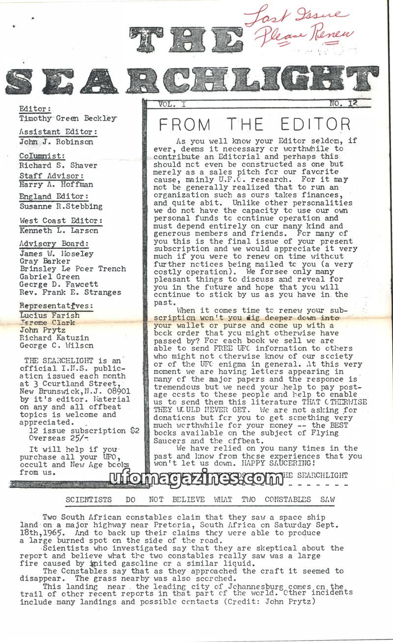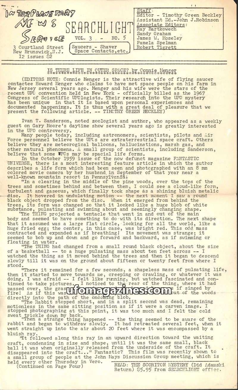 This issue of The Searchlight explores the possibility that UFOs caused the 1965 Northeast blackout, with witness accounts from Syracuse, NY, and Erieau, Ontario. It also details a