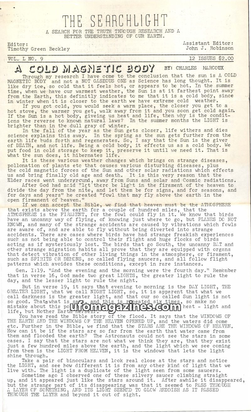 This issue of The Searchlight presents a theory that the Sun is a cold magnetic body, influencing Earth's weather and life cycles. It reinterprets biblical passages to support this