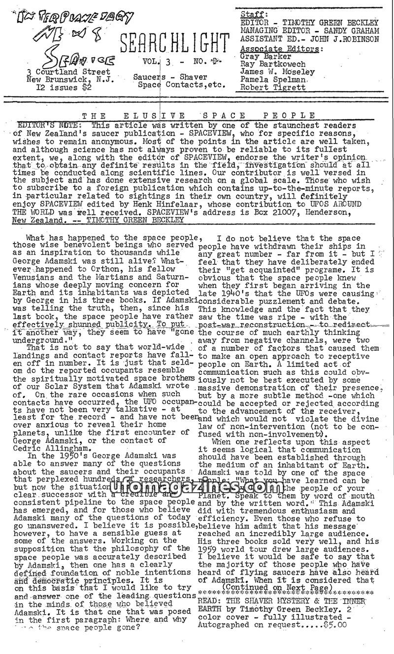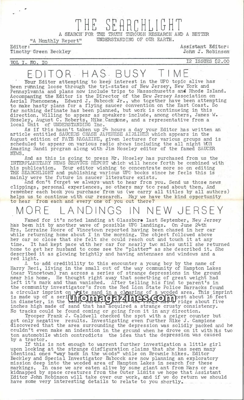 This issue of The Searchlight details the busy schedule of Editor Timothy Green Beckley, who is involved in organizing a UFO convention and writing articles. It reports on multiple