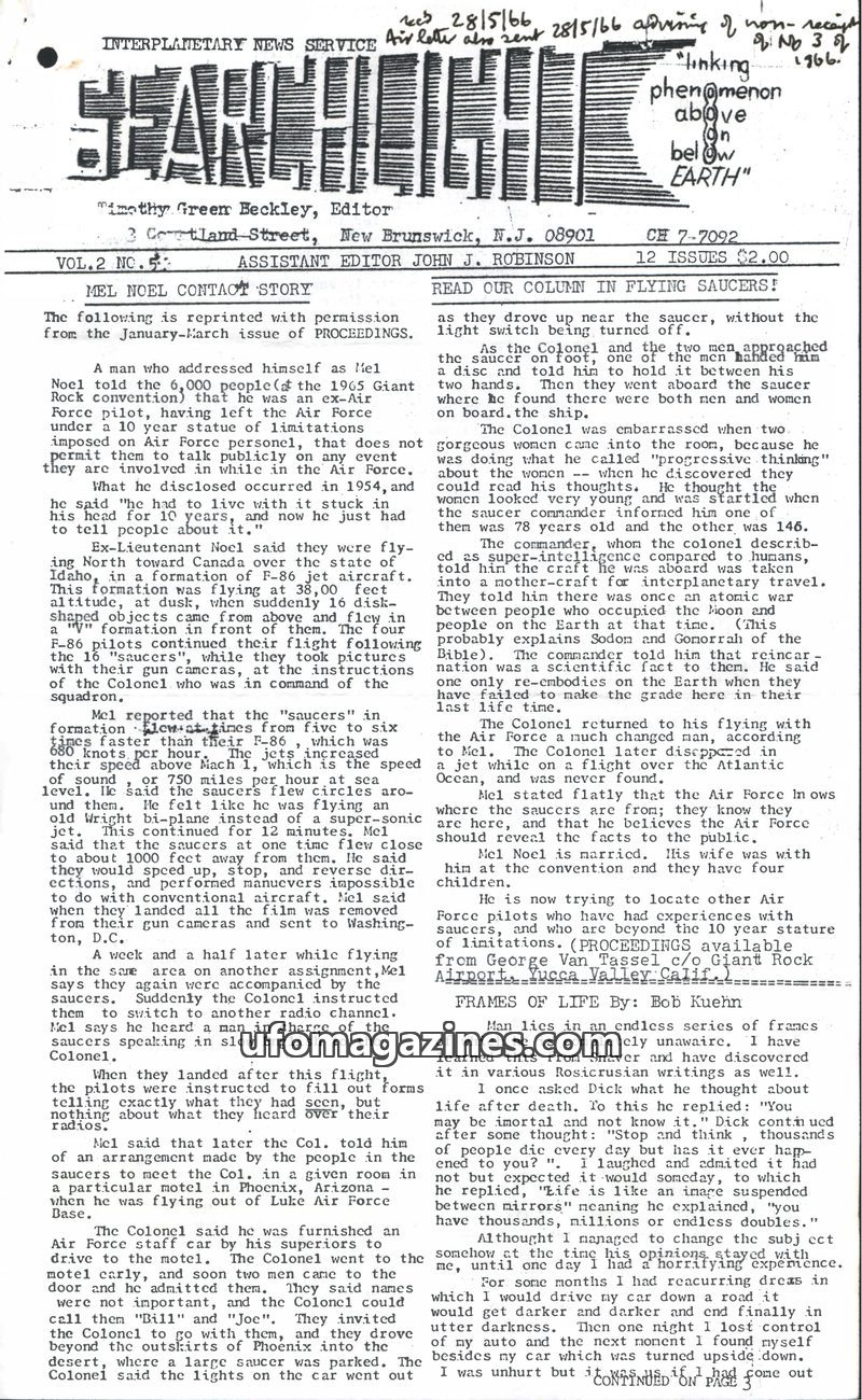 This issue of Interplanetary News Service delves into UFO phenomena of the 1950s and 1960s. It features an account from ex-Air Force pilot Mel Noel about encounters with unidentifi