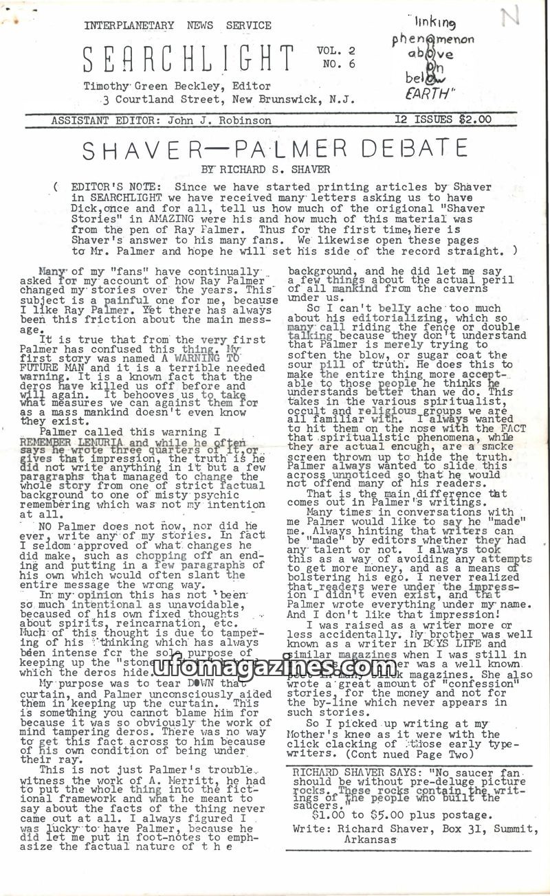 This issue of Searchlight magazine features a debate between Richard Shaver and Ray Palmer regarding the authorship and intent of the "Shaver Stories." Shaver claims Palmer altered