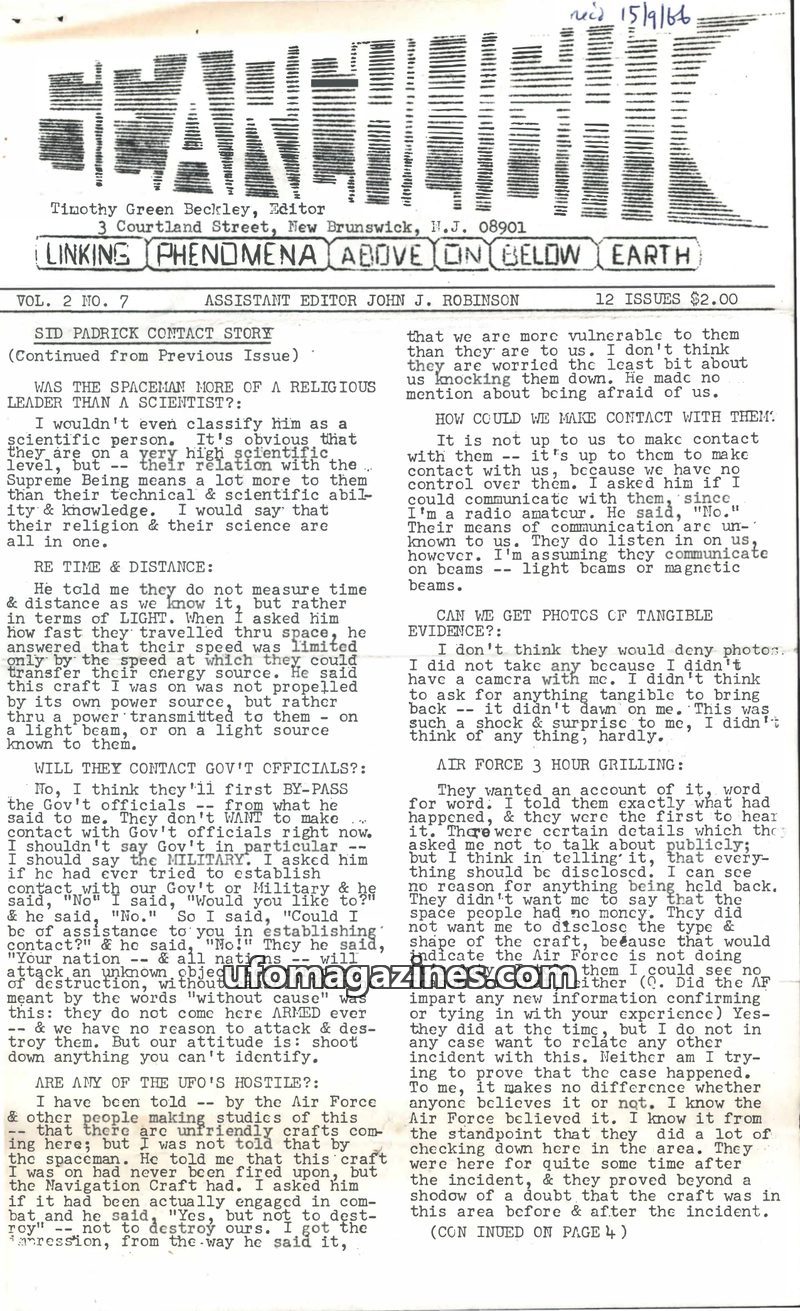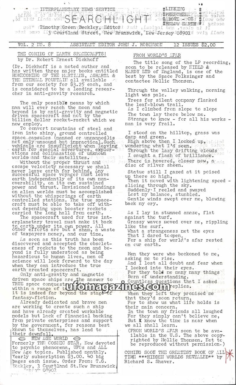 This issue of Searchlight delves into a contactee's experience with an alien named Xeno, who revealed details about their advanced civilization and non-hostile approach. It also ex
