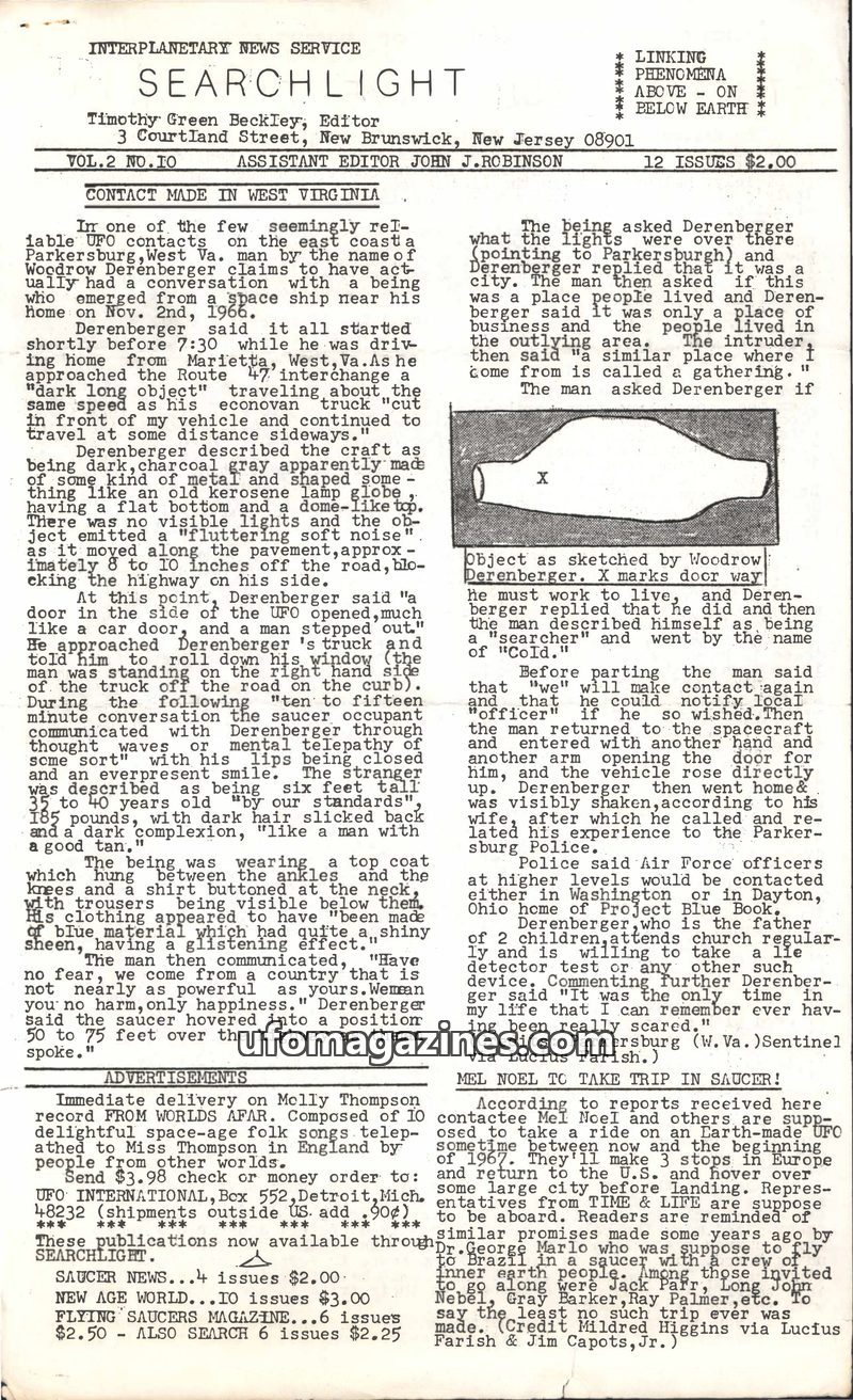 This issue of Searchlight details a claimed UFO contact in West Virginia in 1966 where Woodrow Derenberger reported a conversation with an alien named 'Cold'. It also delves into t