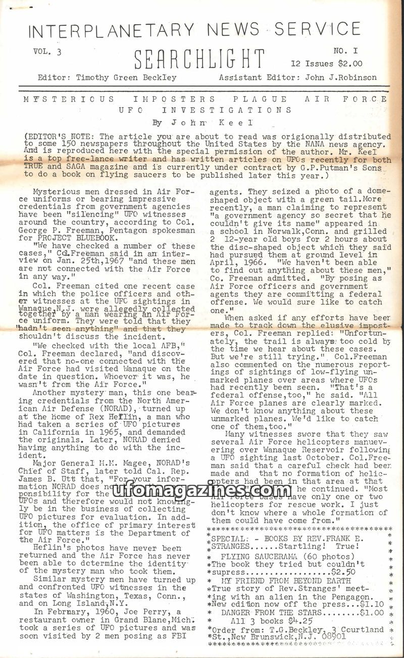 This issue of Searchlight details how individuals posing as Air Force officers and government agents are intimidating UFO witnesses. Col. George P. Freeman of Project Bluebook conf