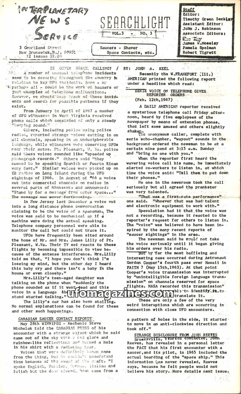 This issue of Searchlight explores unusual telephone incidents reportedly connected to UFO sightings across the US, including beeping sounds and strange voices. It also delves into