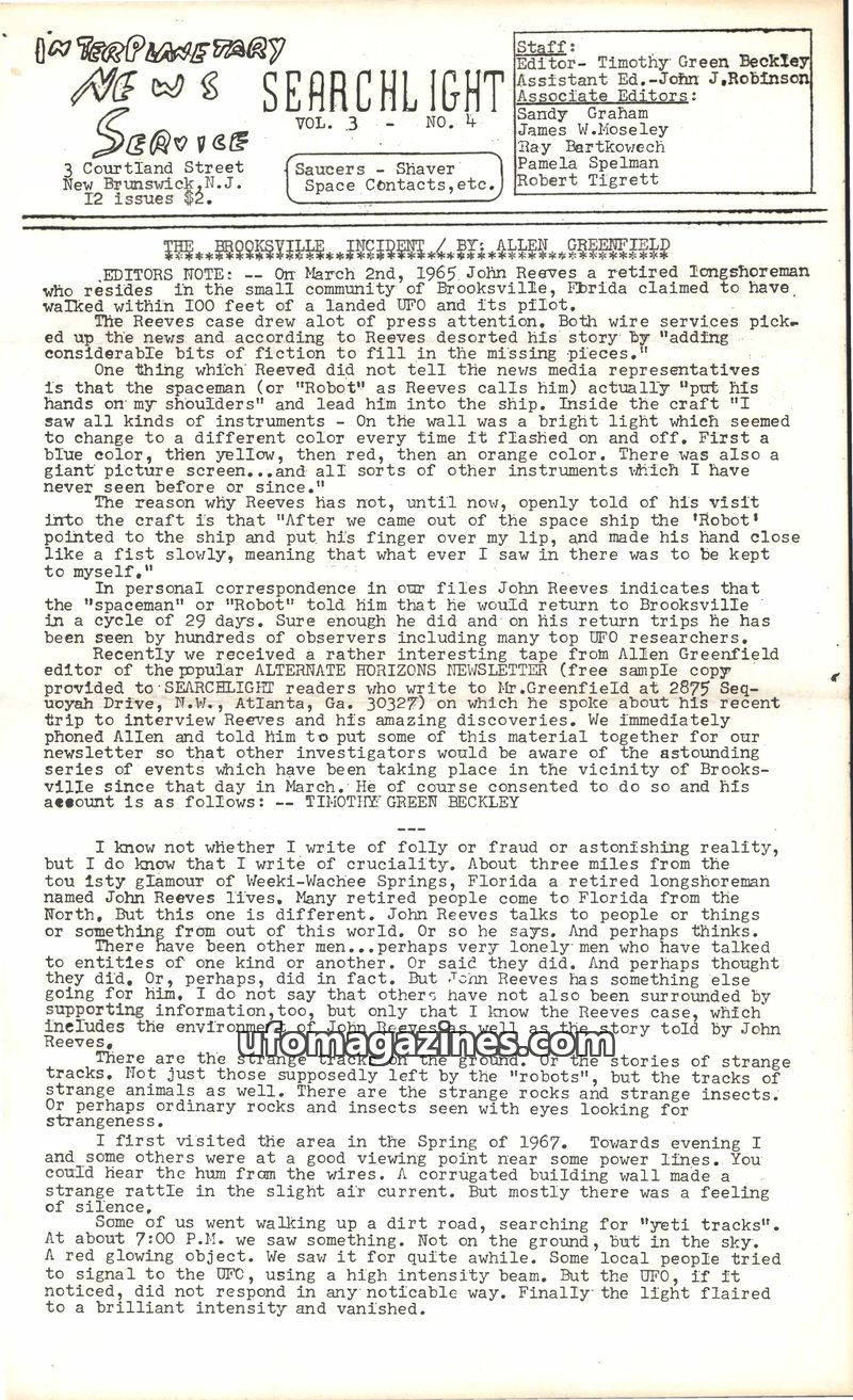 This issue of Interplanetary News Searchlight focuses on the Brooksville, Florida UFO incidents involving John Reeves, who claimed contact with an alien and entry into a landed cra