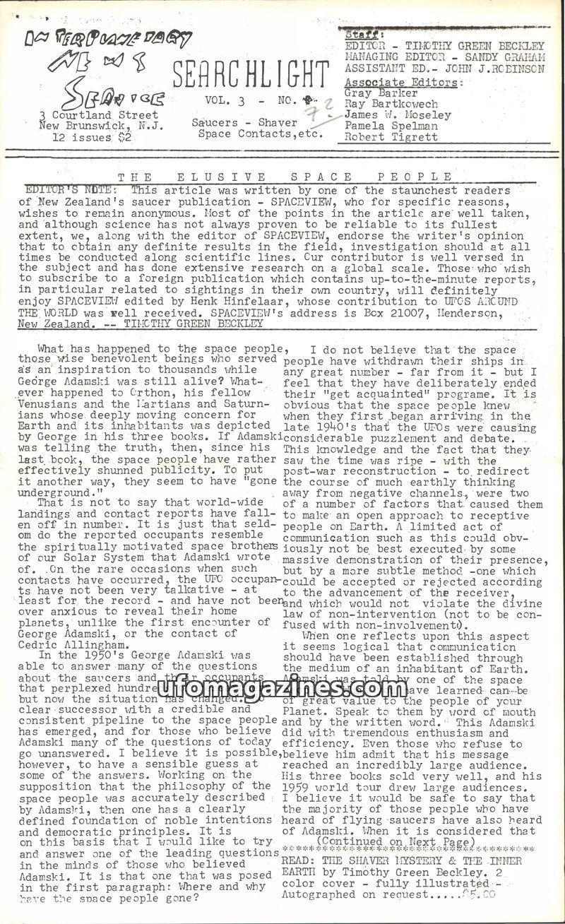 This issue of Searchlight delves into the disappearance of the 'Space People' described by George Adamski, questioning why their public interactions ceased. It explores the possibi