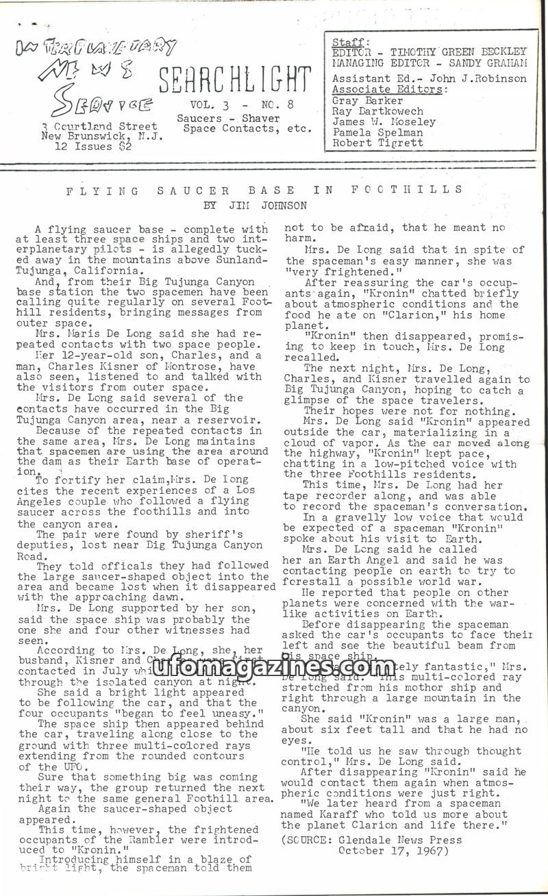 This issue of Searchlight magazine, dated October 17, 1967, features a report on an alleged flying saucer base in the Big Tujunga Canyon, California, with spacemen named 'Kronin' a