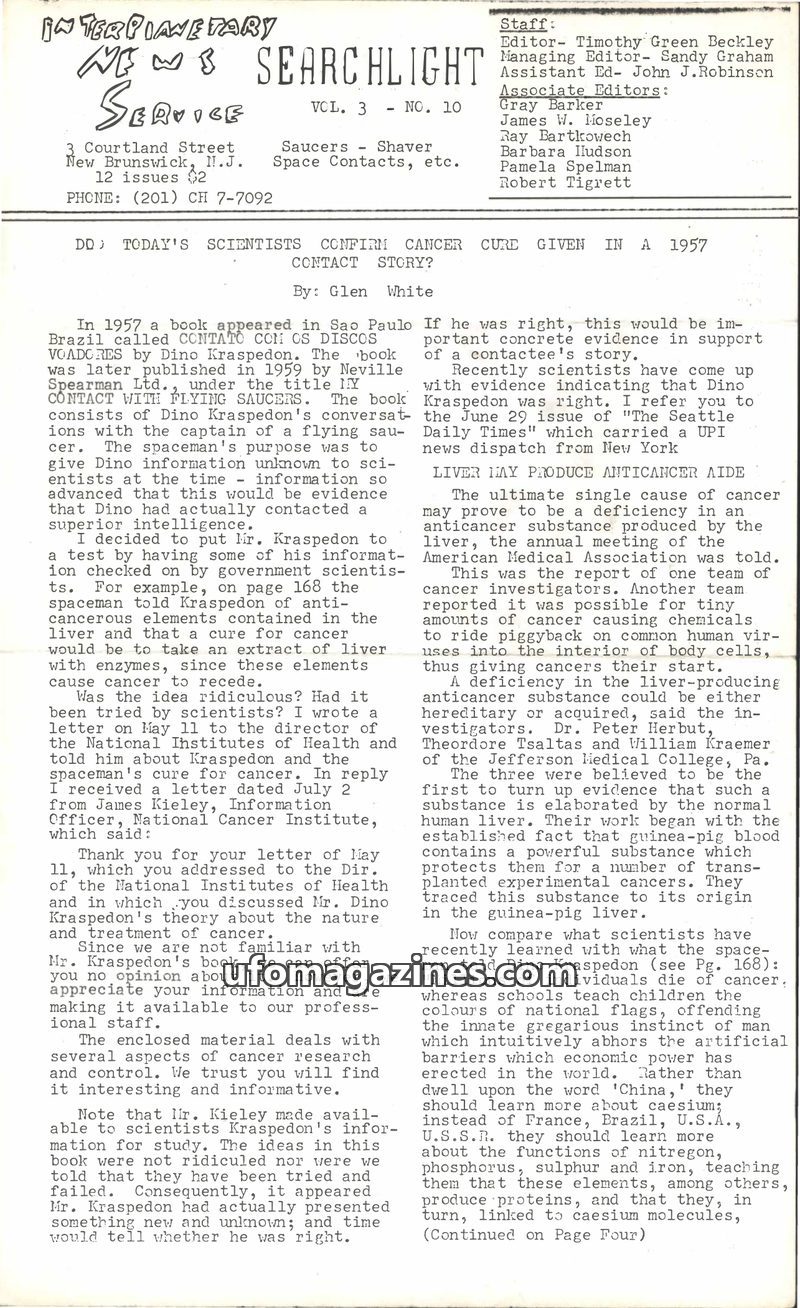 This issue of Searchlight Service explores a 1957 claim by Dino Kraspedon that a spaceman revealed a liver-based cancer cure, which is now being investigated by scientists. It also