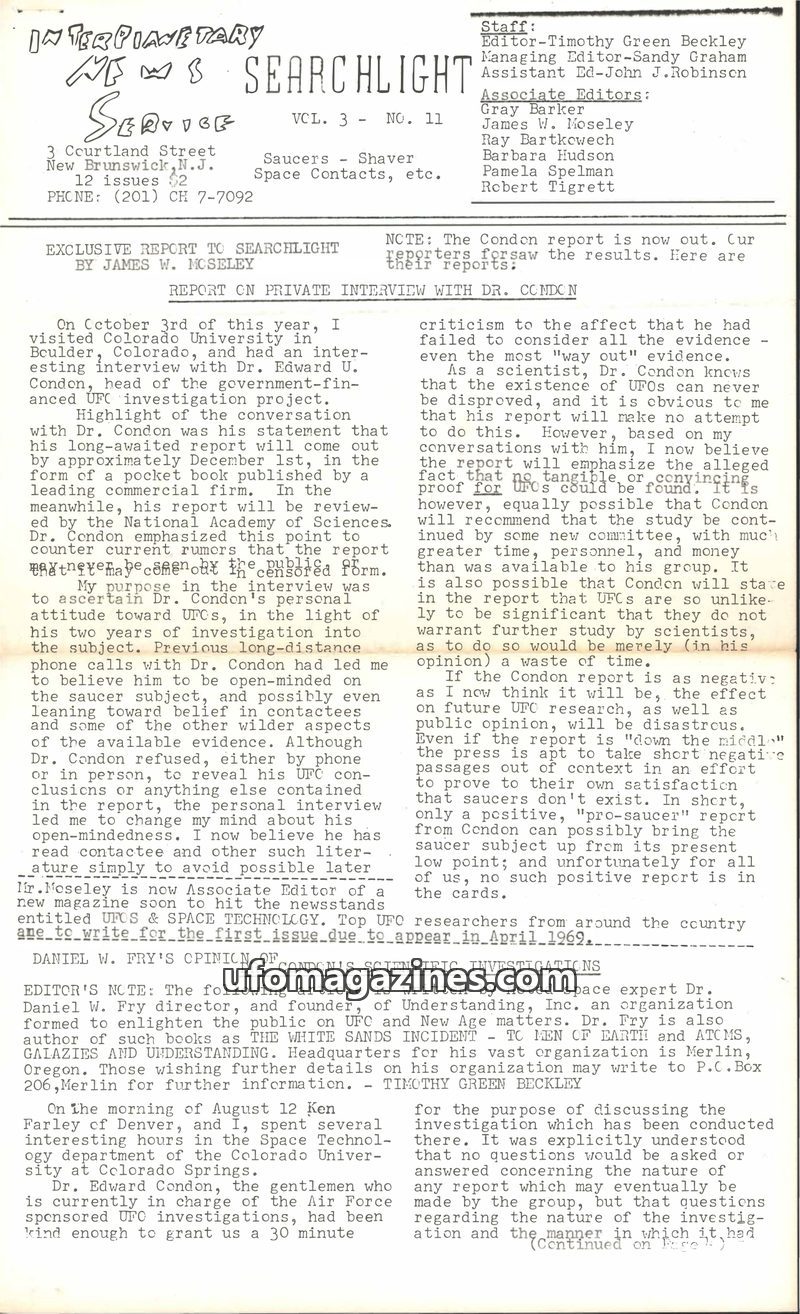 This issue of Interplanetary News Searchlight features an exclusive report by James W. Moseley on his interview with Dr. Edward U. Condon regarding the government-financed UFO inve