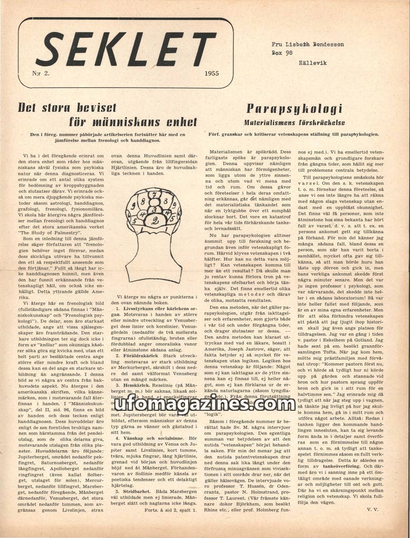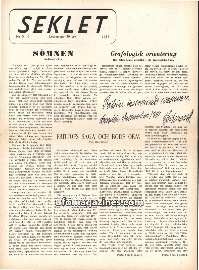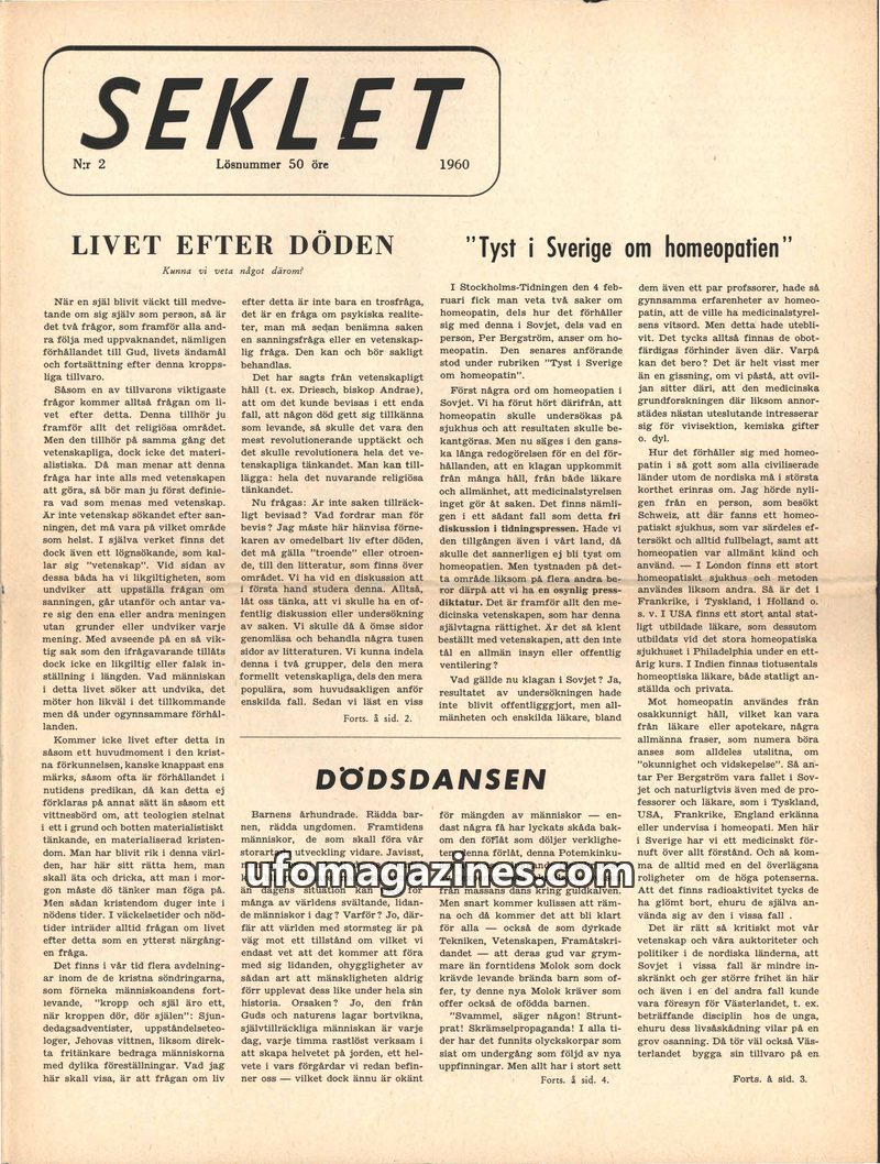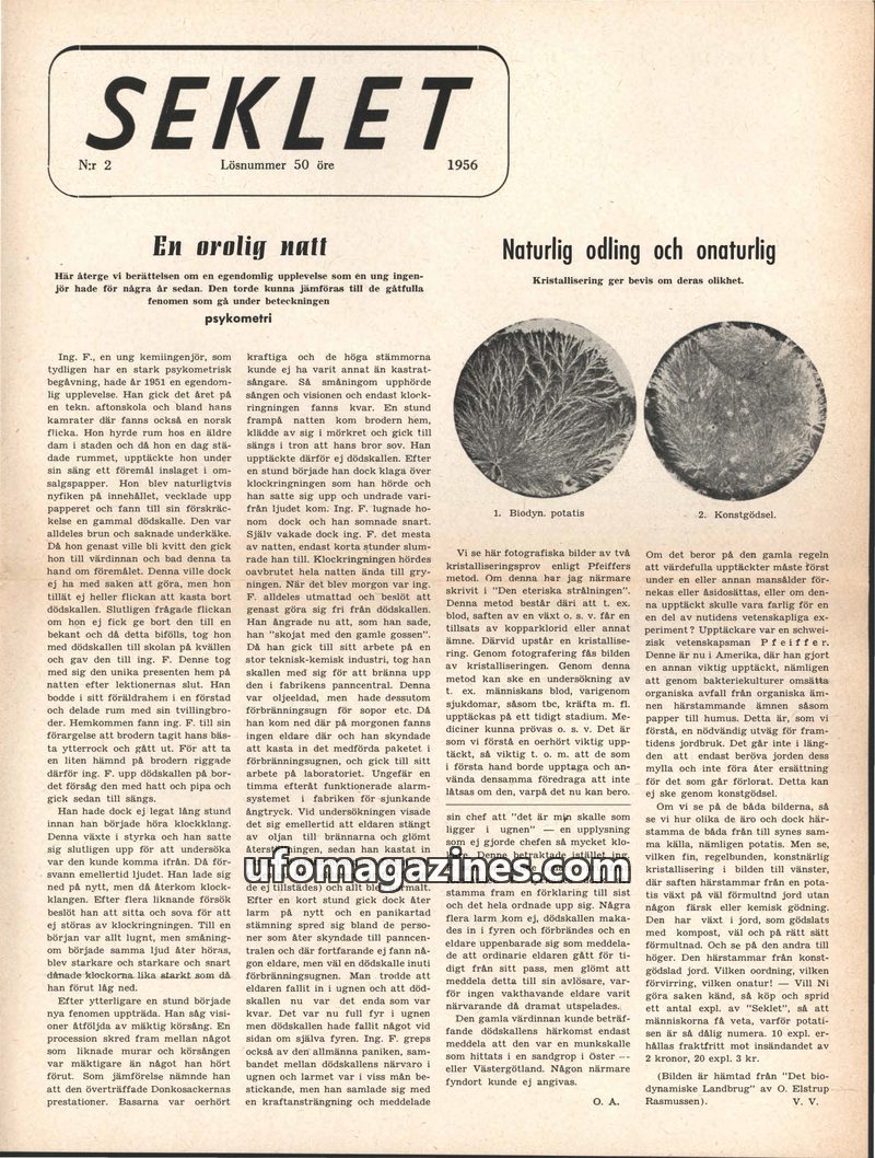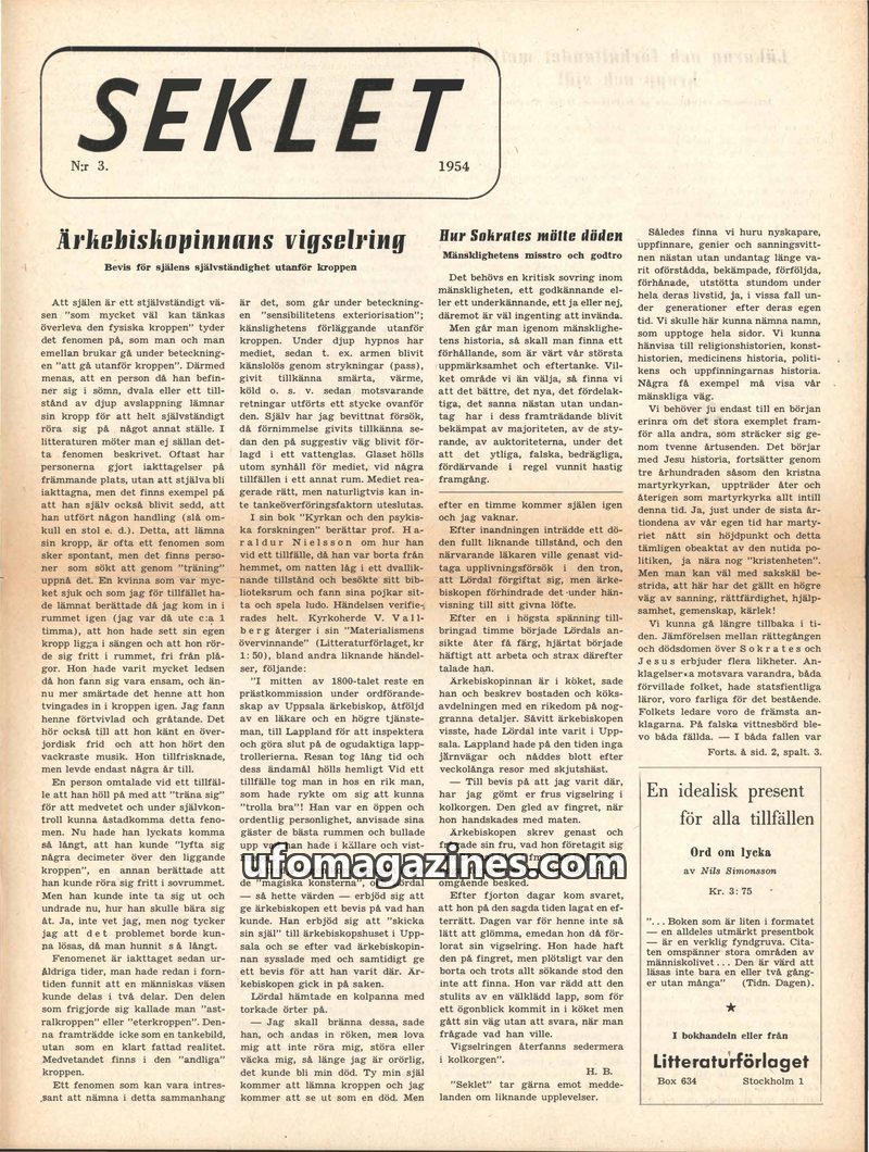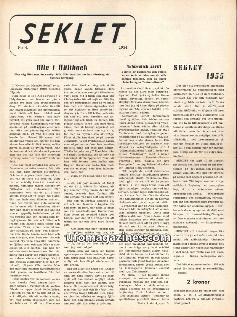 This issue of 'SEKLET' delves into various esoteric and practical topics. It features a story about Olle Andersson's psychic premonition of his wife's death and a chilling account