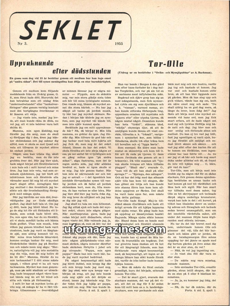 This issue of SEKLET from 1955 delves into spiritual and paranormal topics. A significant article recounts the post-death experience of a 15-year-old boy, G.S., who communicates th