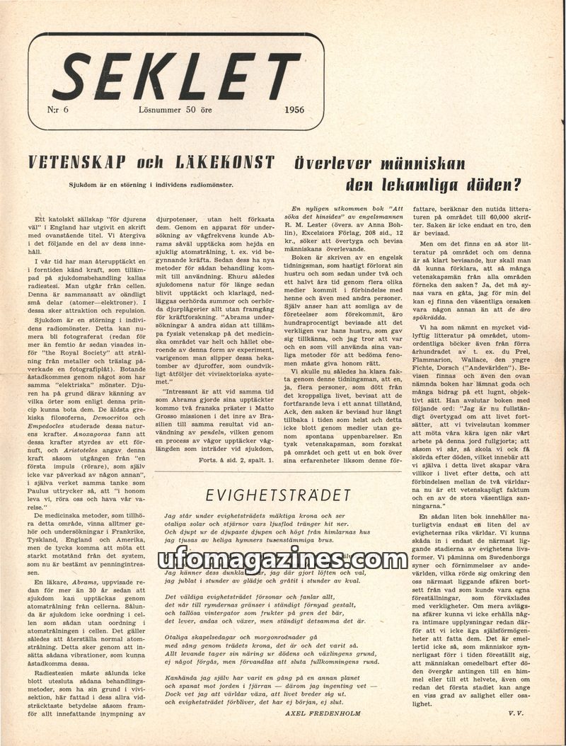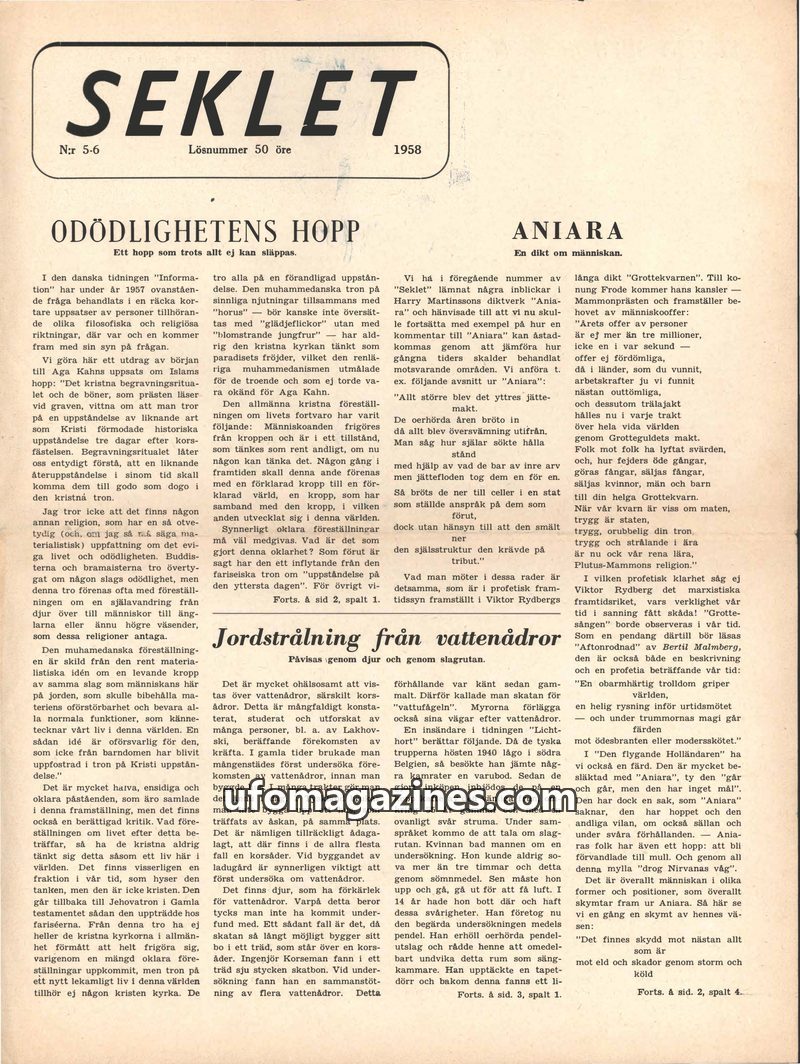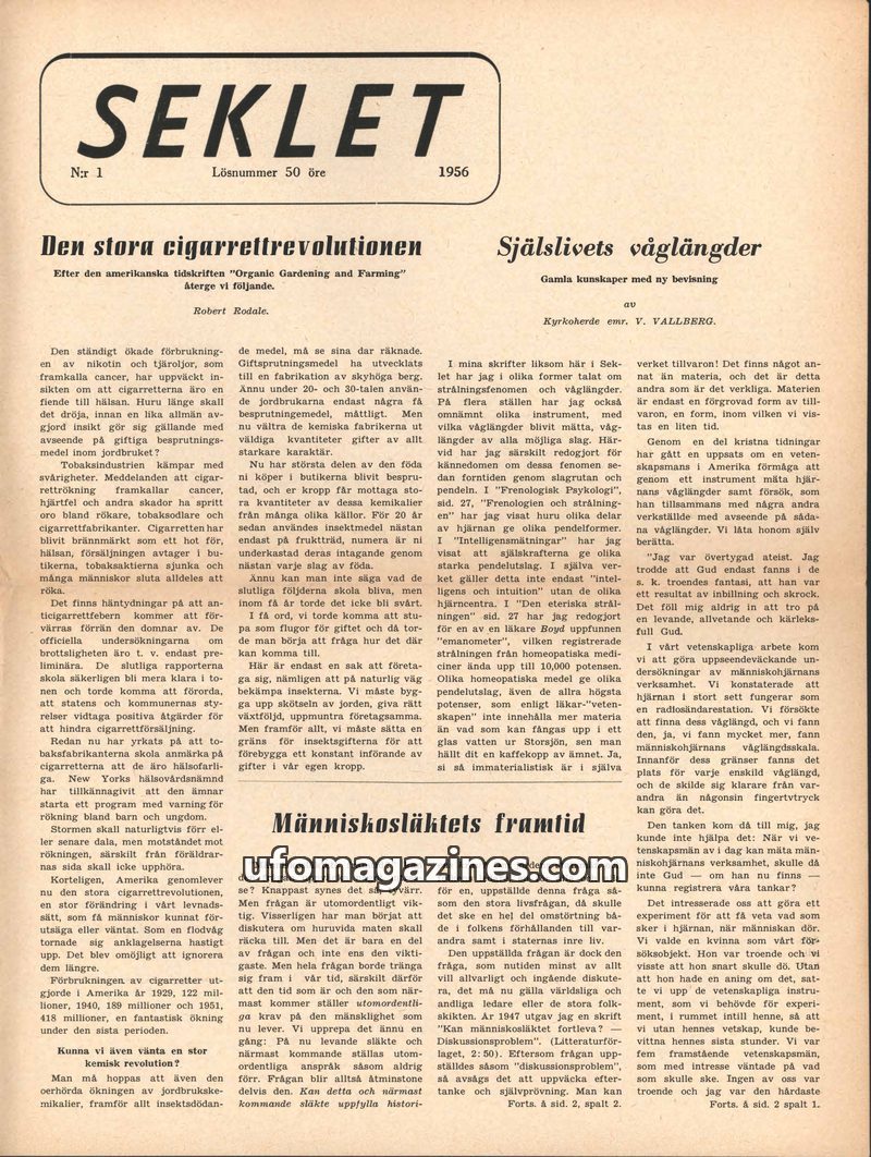 This issue of SEKLET magazine from 1956 delves into various topics. One article discusses radiesthesia as a healing method, claiming disease is a disturbance in an individual's rad